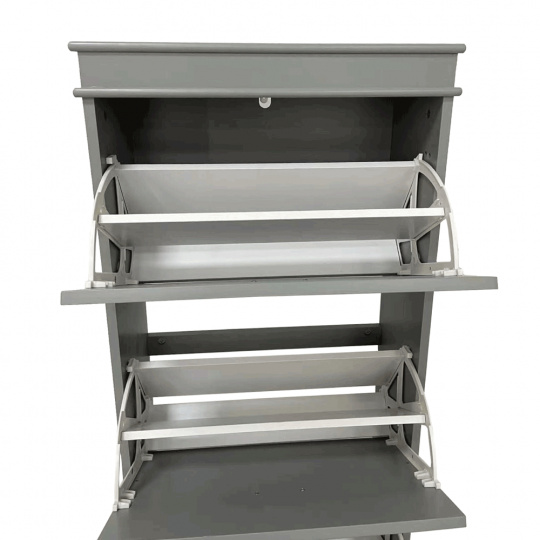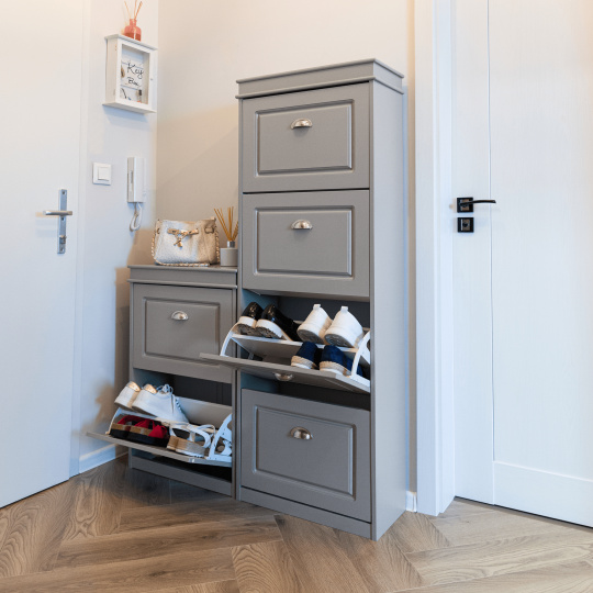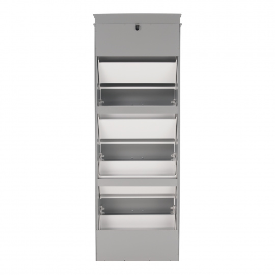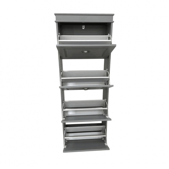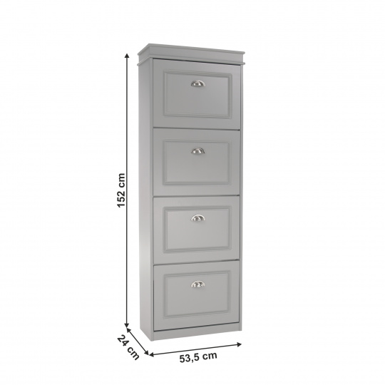Materiál: MDF/dřevotříska Barva: šedá Rozměry (ŠxHxV): 53,5x24x152 cm 4-řadý Vhodný pro 16 párů bot Výklopné šuplíky S úchytkami Hmotnost: 25,2 kg Nosnost: 90 kg Dodáváno v demontu