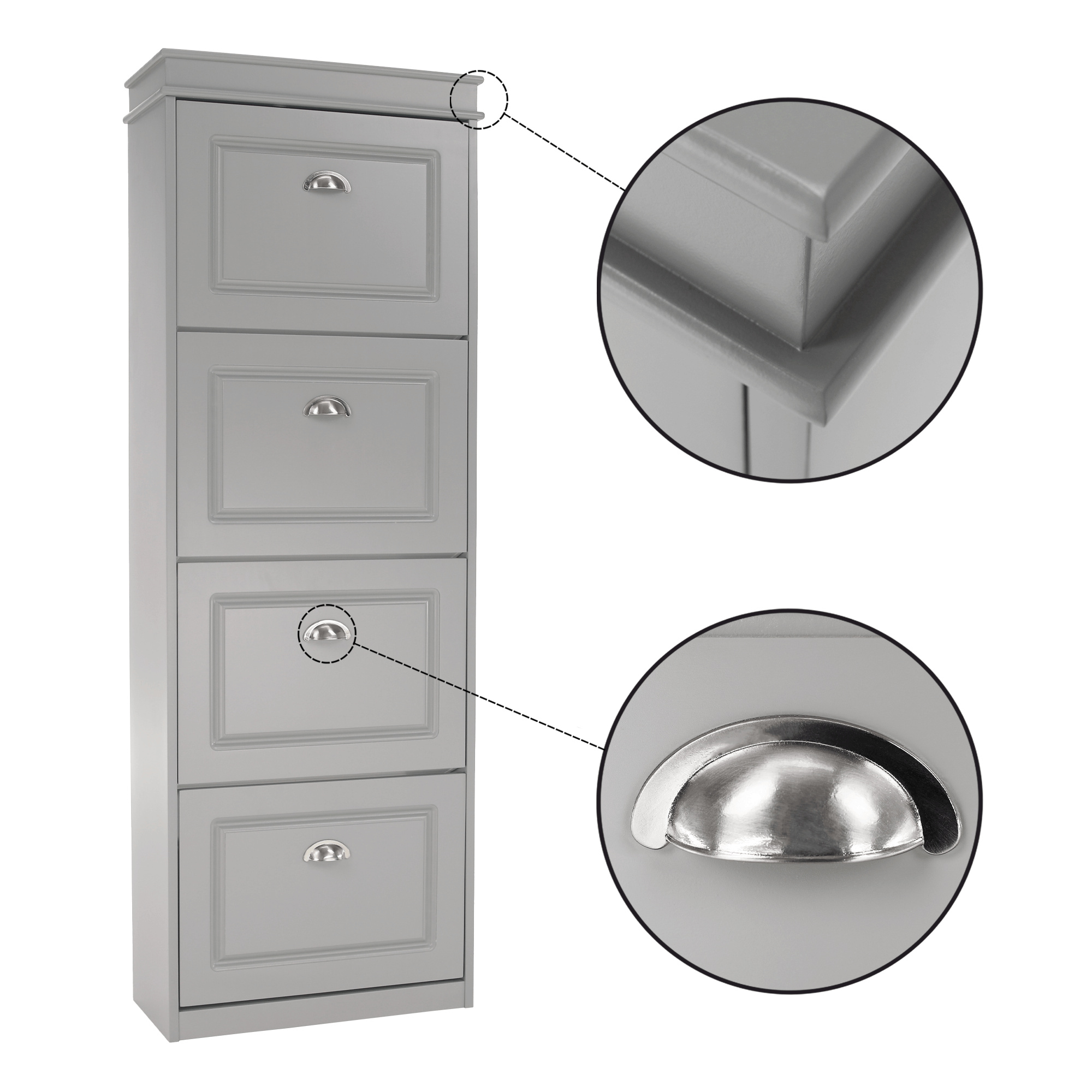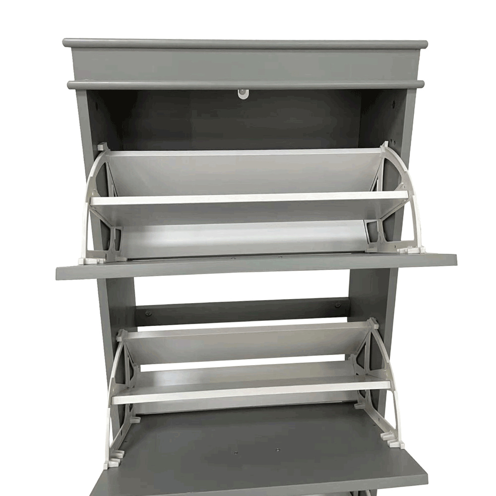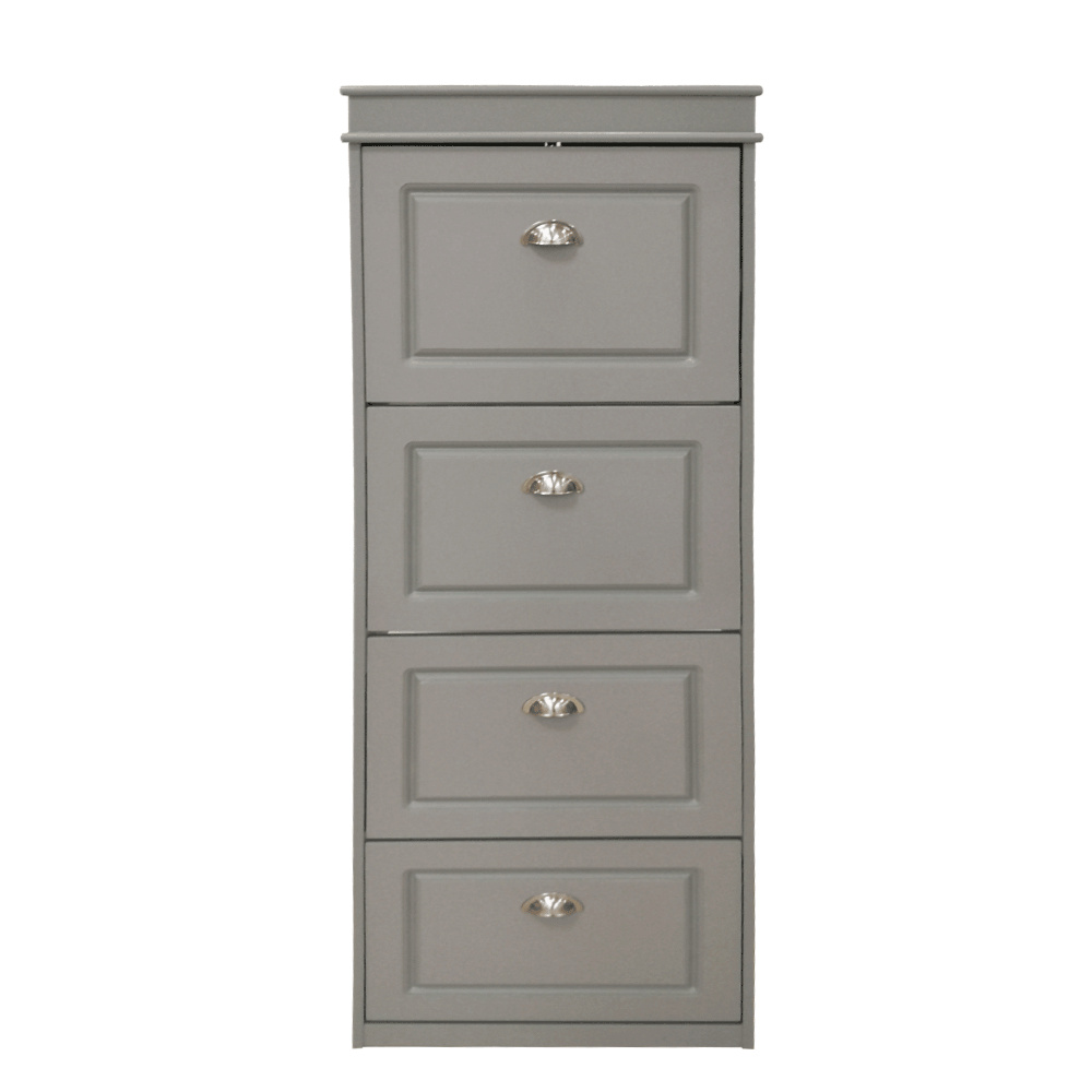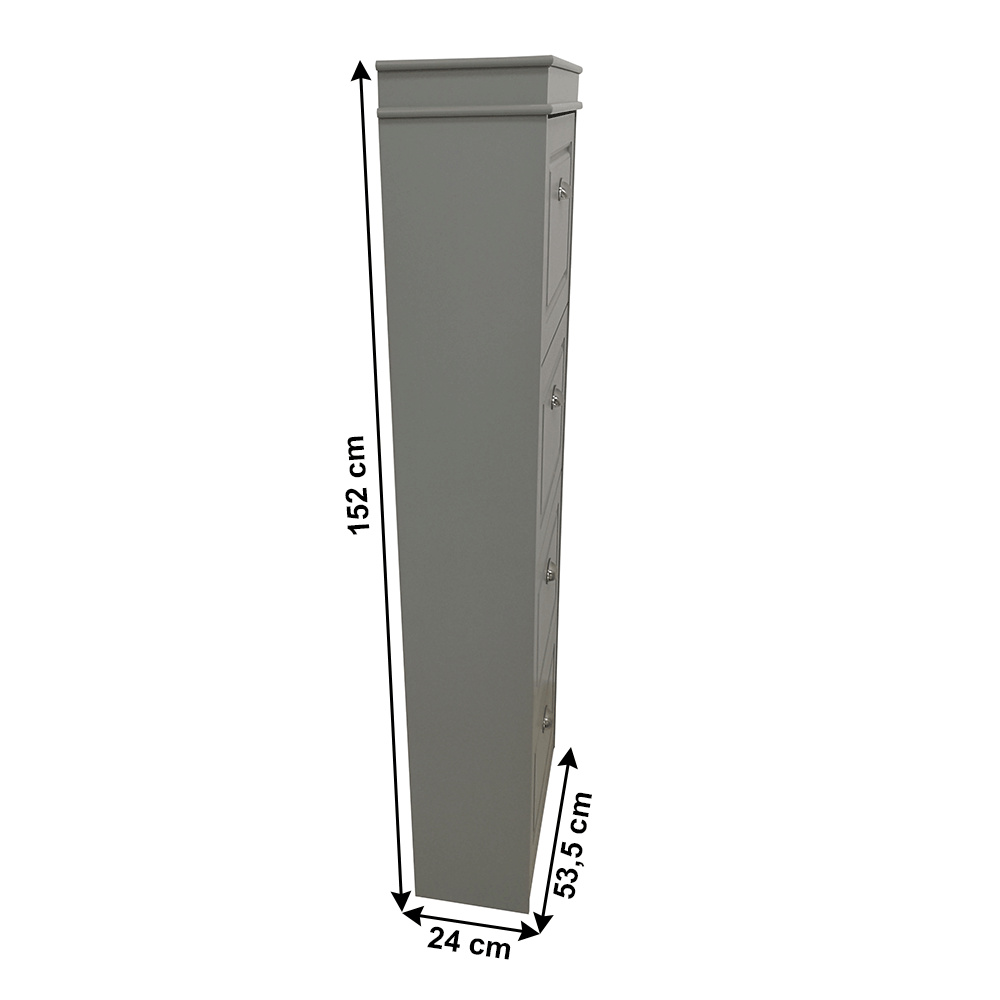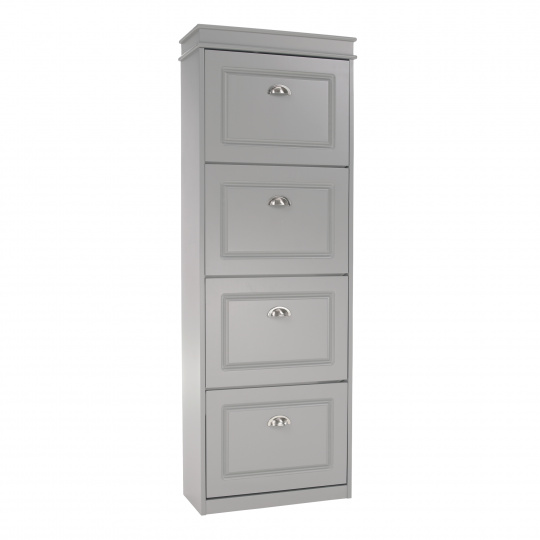 Materiál: MDF/dřevotříska Barva: šedá Rozměry (ŠxHxV): 53,5x24x152 cm 4-řadý Vhodný pro 16 párů bot Výklopné šuplíky S úchytkami Hmotnost: 25,2 kg Nosnost: 90 kg Dodáváno v demontu