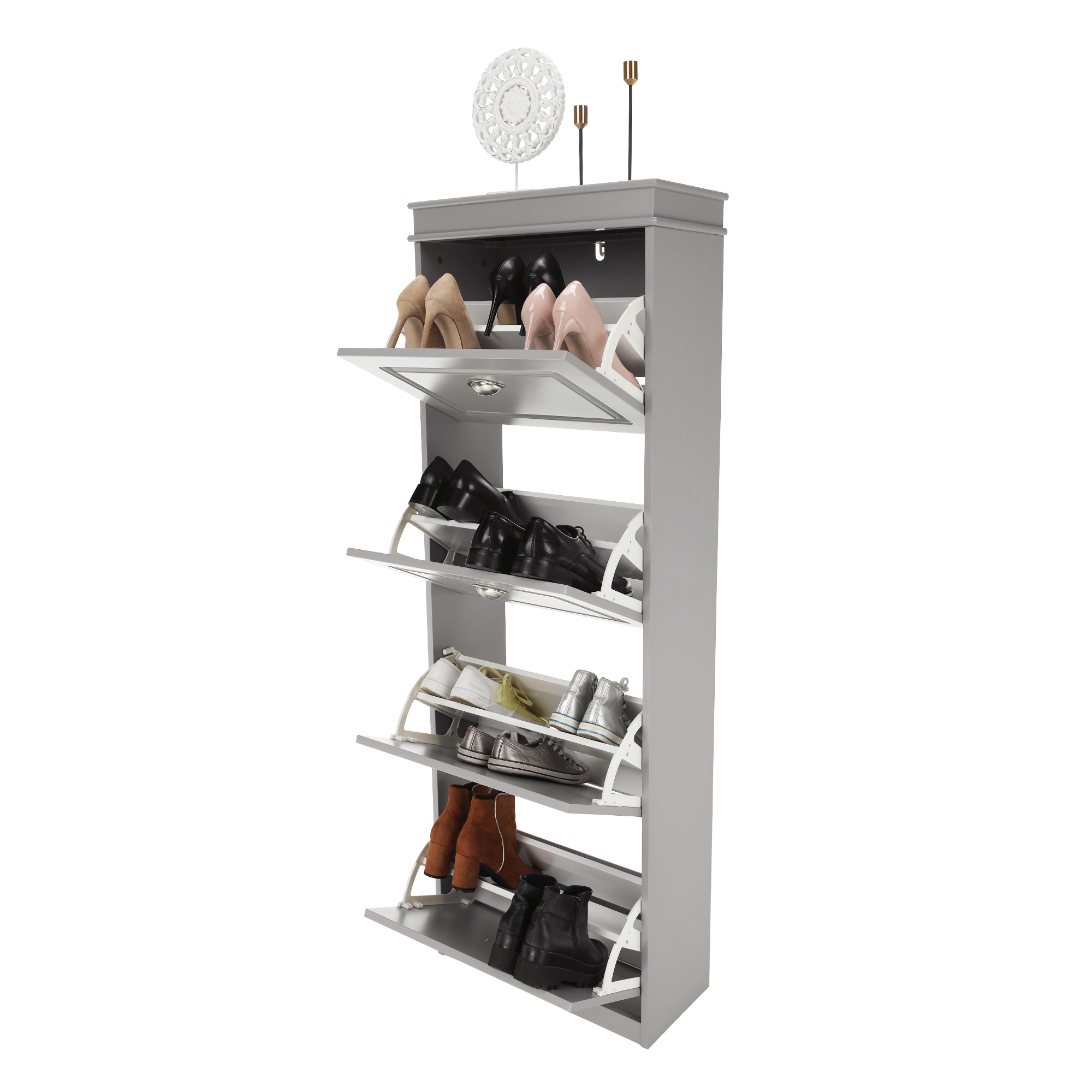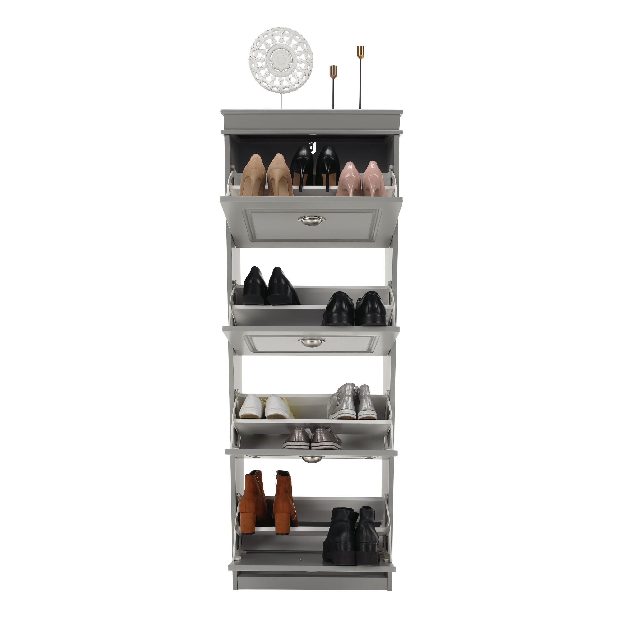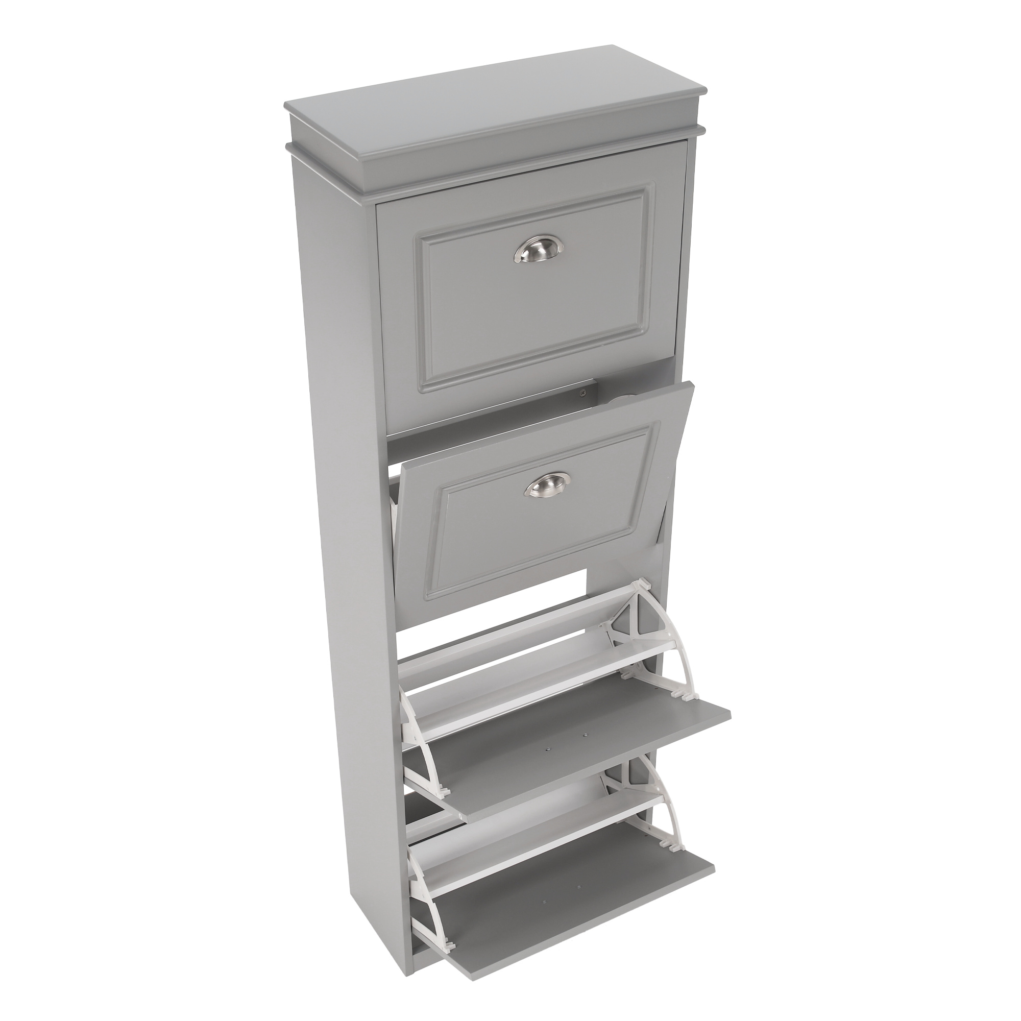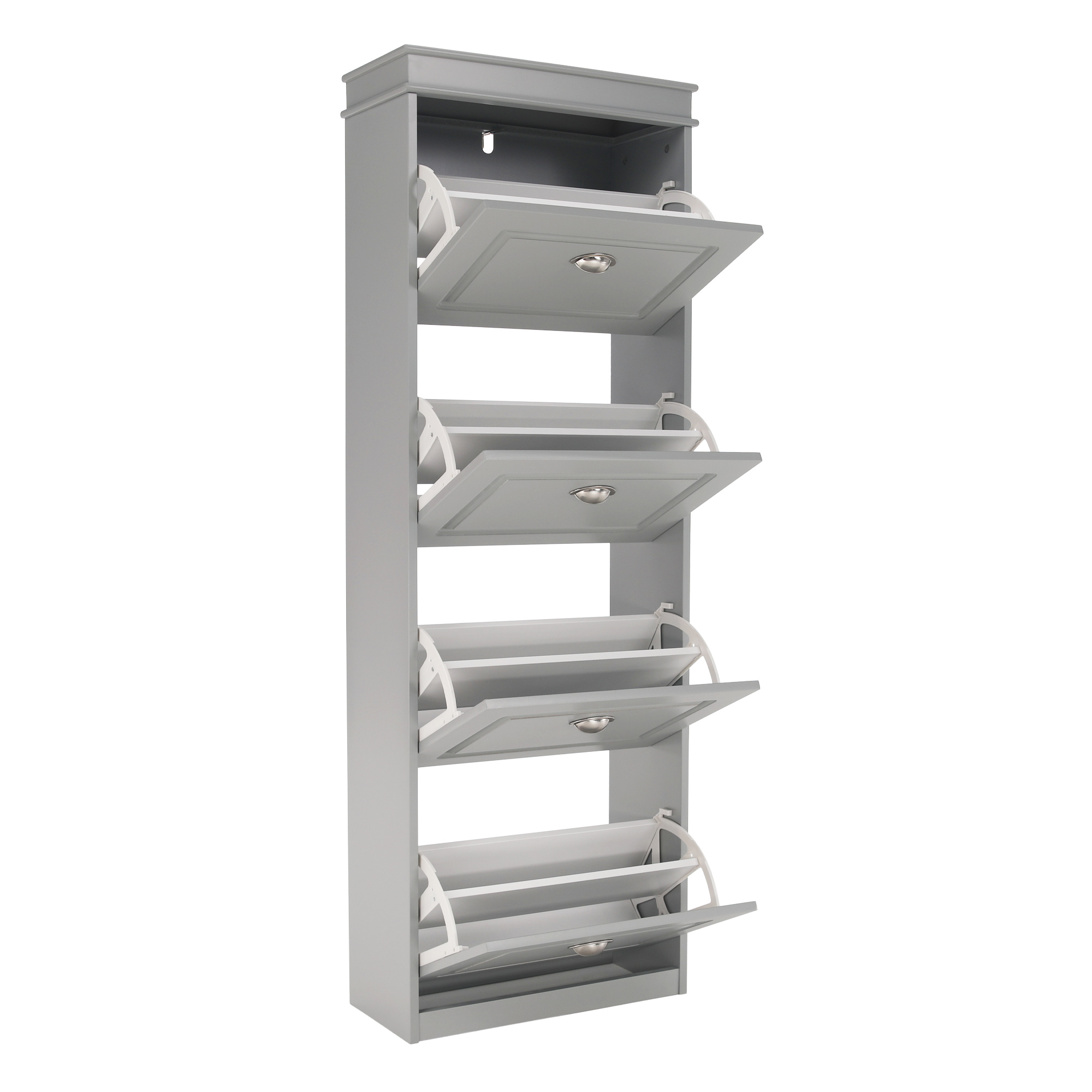 Materiál: MDF/dřevotříska Barva: šedá Rozměry (ŠxHxV): 53,5x24x152 cm 4-řadý Vhodný pro 16 párů bot Výklopné šuplíky S úchytkami Hmotnost: 25,2 kg Nosnost: 90 kg Dodáváno v demontu