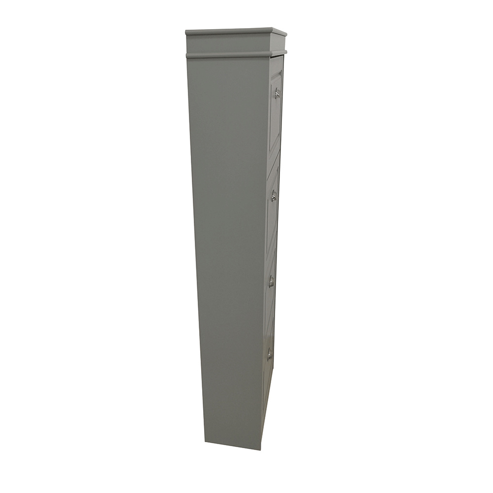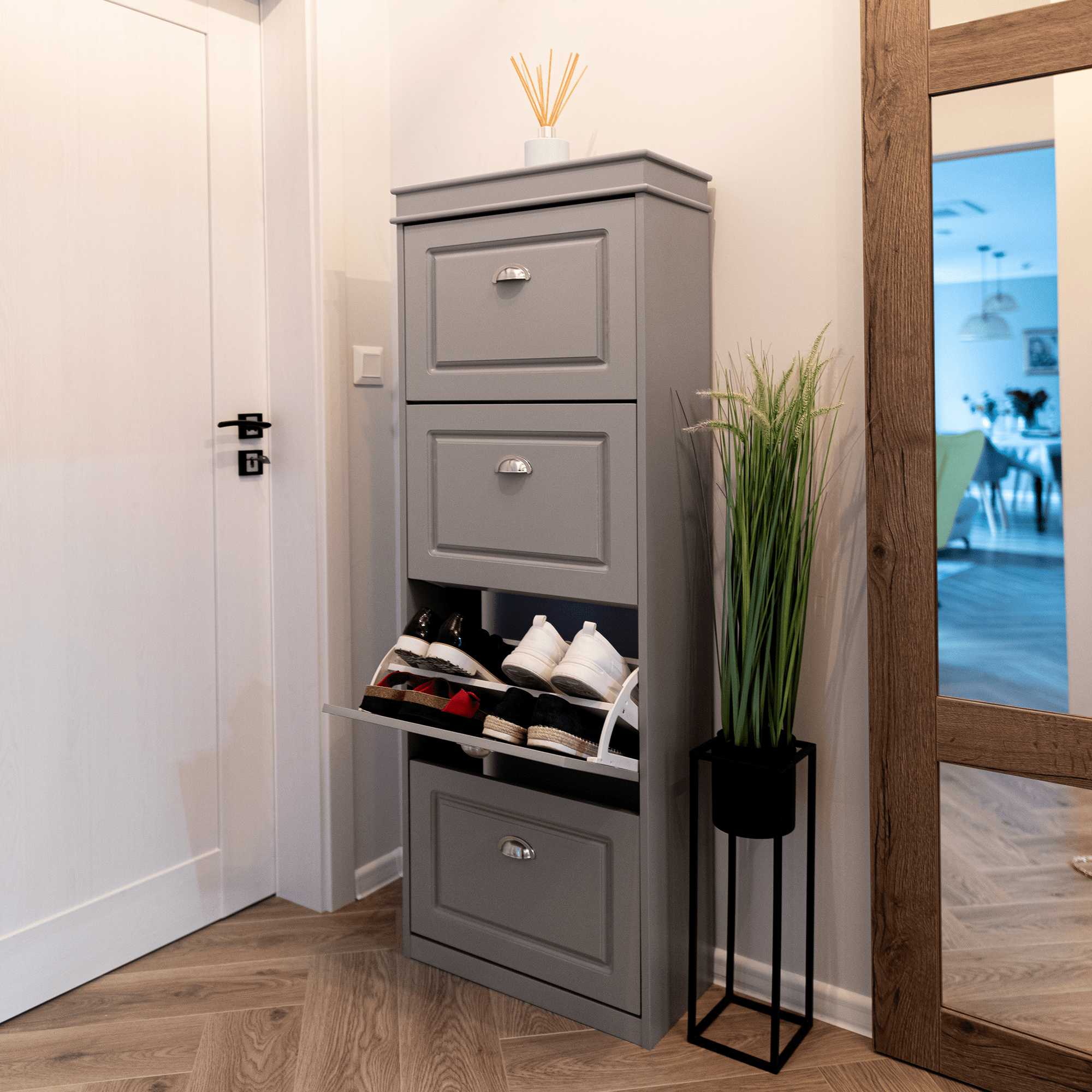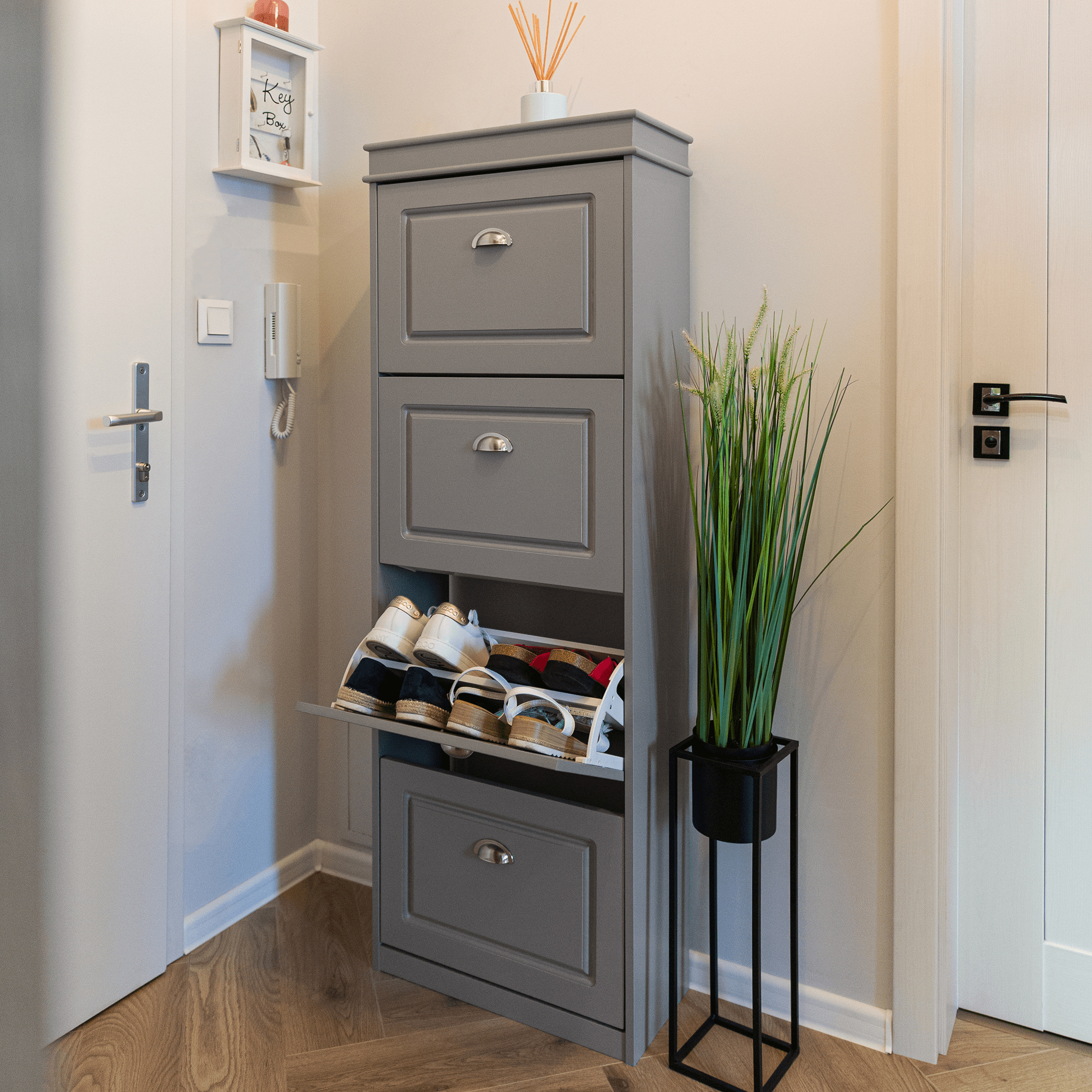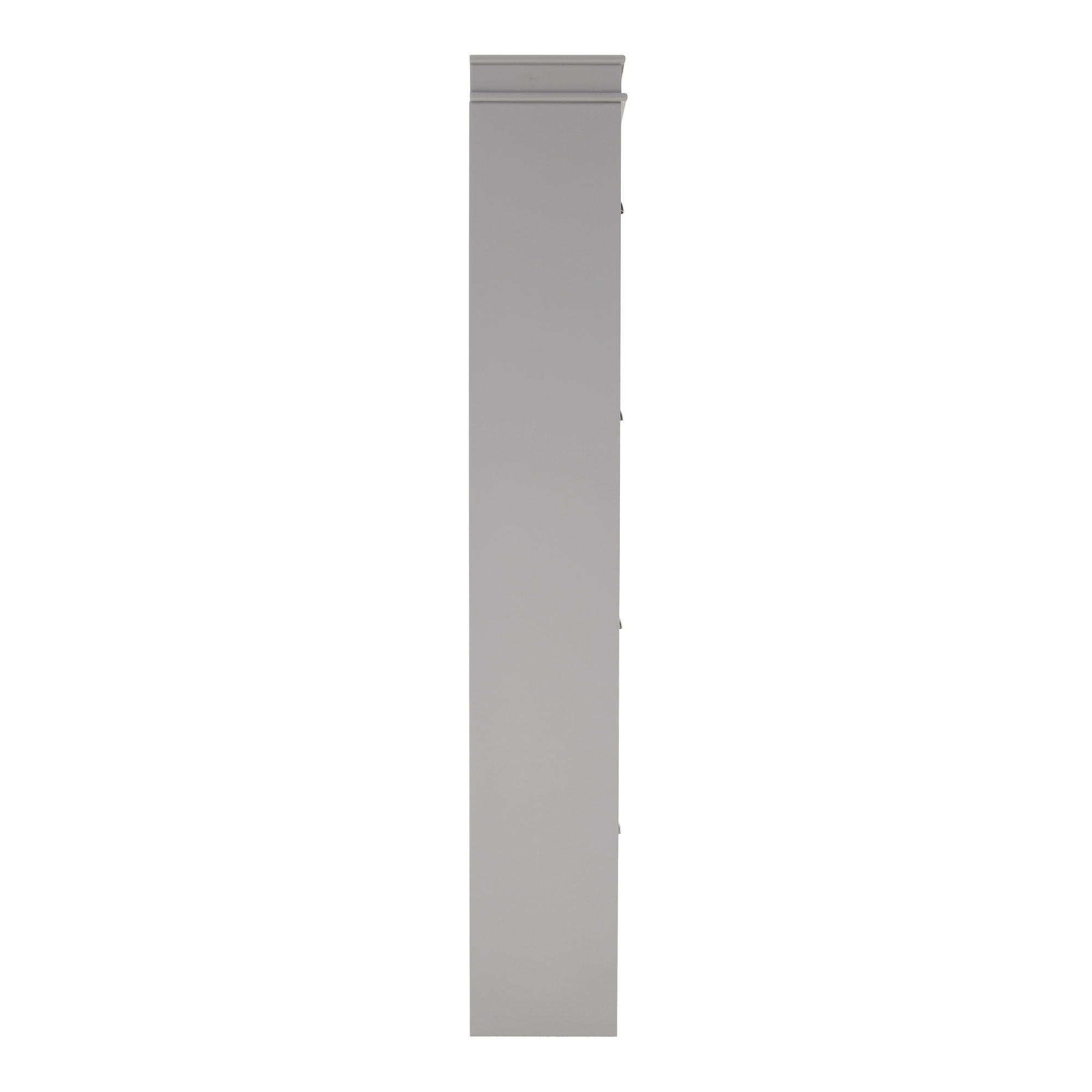 Materiál: MDF/dřevotříska Barva: šedá Rozměry (ŠxHxV): 53,5x24x152 cm 4-řadý Vhodný pro 16 párů bot Výklopné šuplíky S úchytkami Hmotnost: 25,2 kg Nosnost: 90 kg Dodáváno v demontu