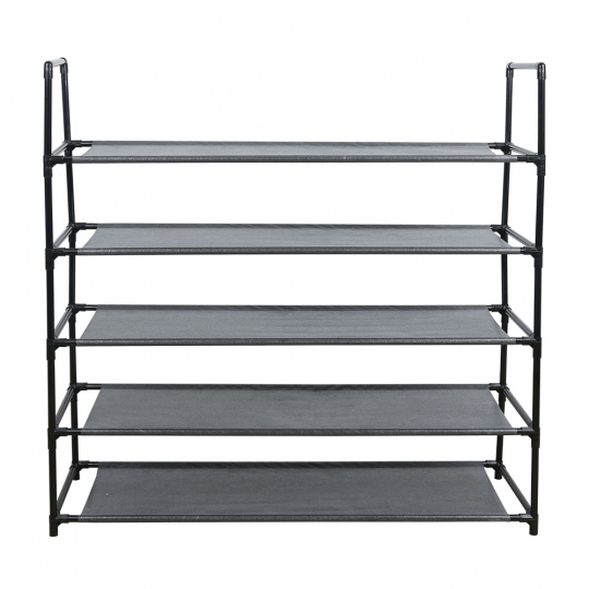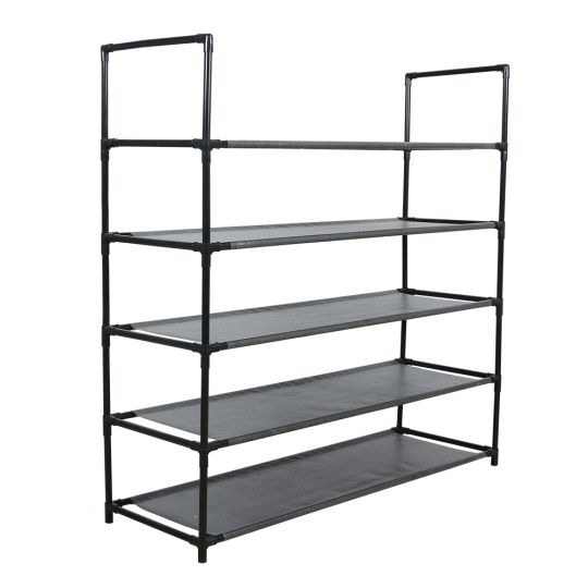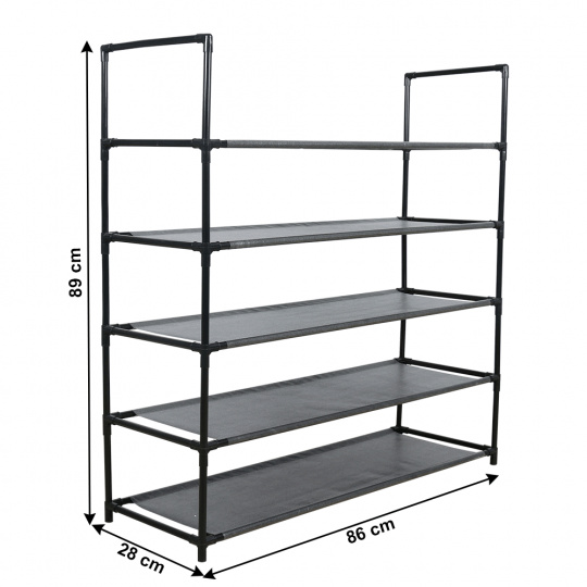 Materiál konstrukce: kov Barva: černá Materiál police: látka Barva: černá Rozměry (ŠxHxV): 86x28x89 cm 5-řadový botník Výška mezi policemi: 15 cm Vhodný pro 20-25 párů bot Jednoduchý a praktický stabilní konstrukce jednoduchá montáž snadná údržba Nosnost: 15 kg (rovnoměrná zátěž) Dodávané v monte