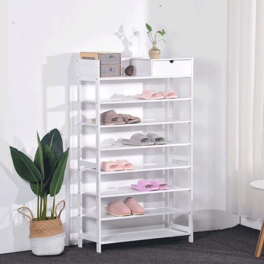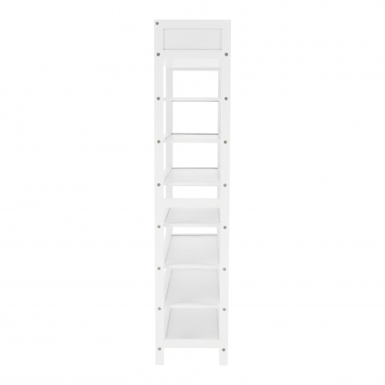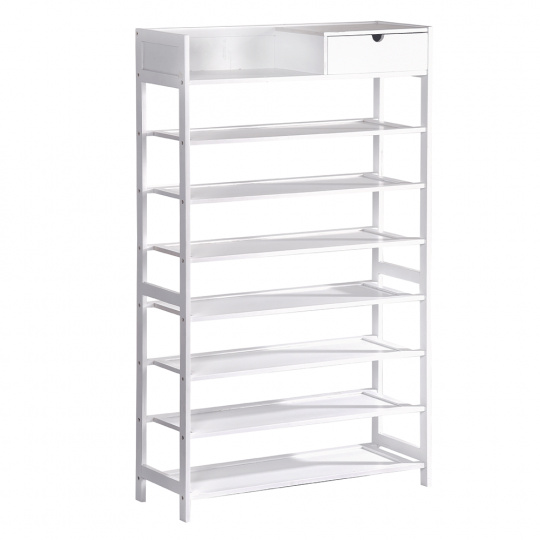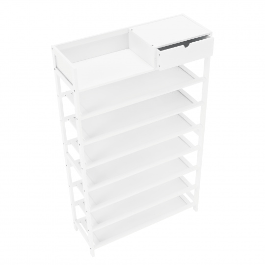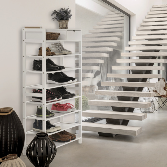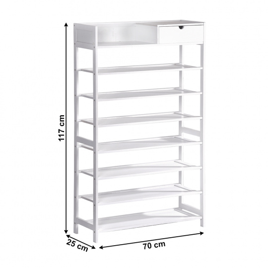 Materiál konstrukce: bambus lakovaný Barva konstrukce: bílá Rozměry (ŠxHxV): 70x25x117 cm 7-řadový botník Prostor pro organizaci v předsíni, vstupní hale nebo šatníku Jednoduchý a praktický regál na boty Otevřené police a jedna zásuvka přírodní design jednoduchá montáž snadná údržba Nosnost: 50 kg (rovnoměrná zátěž) Dodávané v demontu