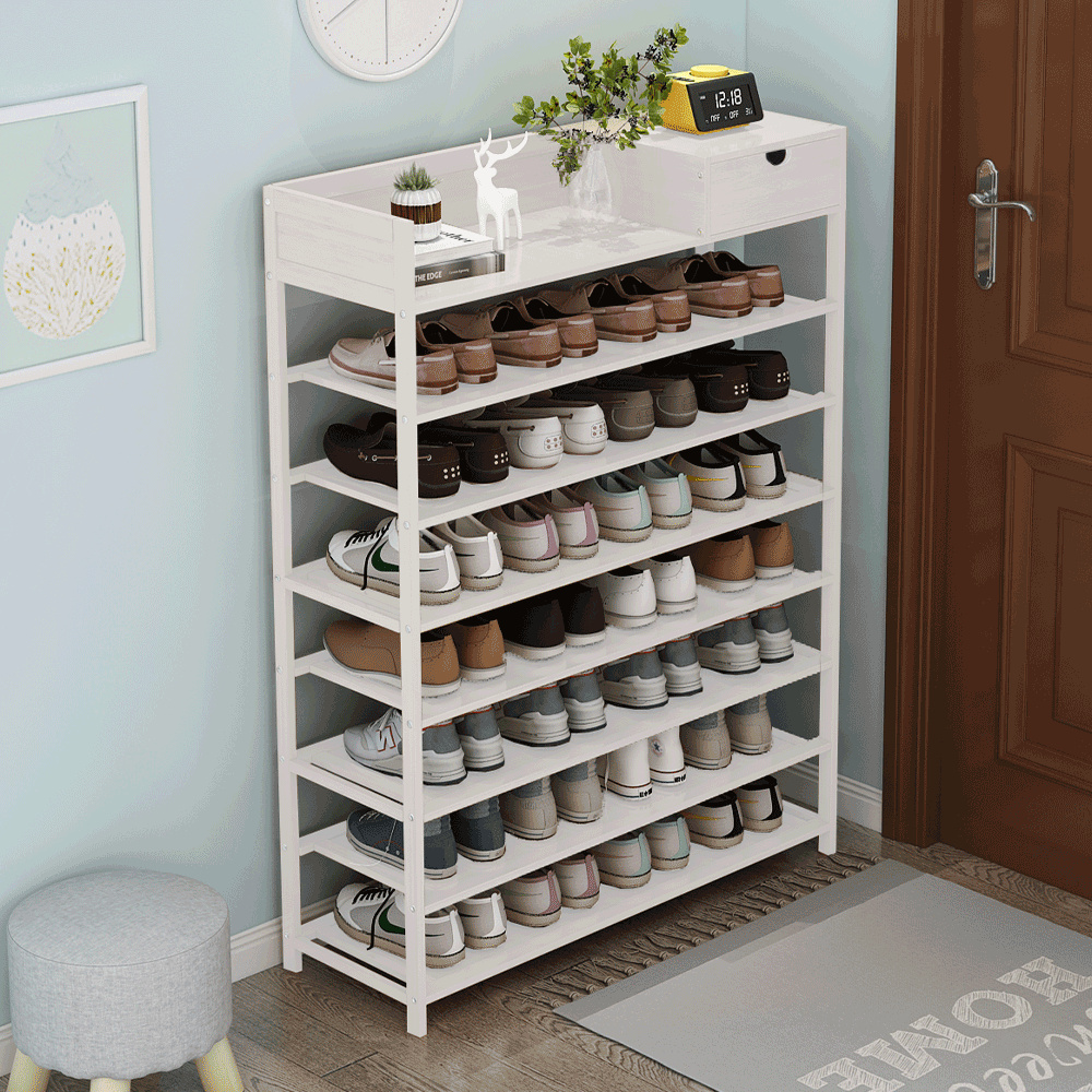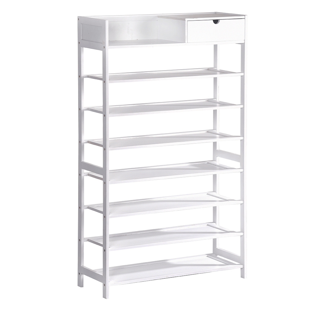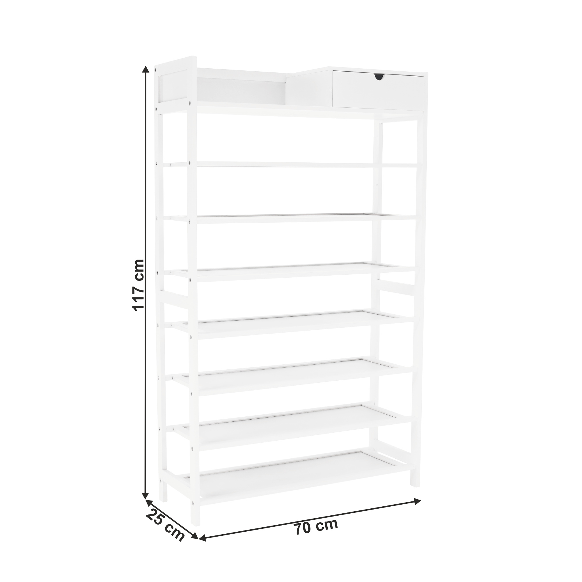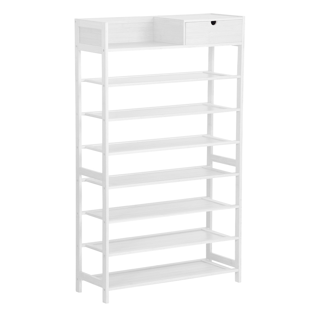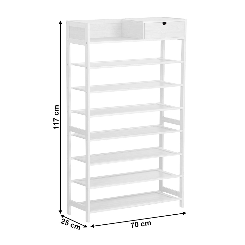Materiál konstrukce: bambus lakovaný Barva konstrukce: bílá Rozměry (ŠxHxV): 70x25x117 cm 7-řadový botník Prostor pro organizaci v předsíni, vstupní hale nebo šatníku Jednoduchý a praktický regál na boty Otevřené police a jedna zásuvka přírodní design jednoduchá montáž snadná údržba Nosnost: 50 kg (rovnoměrná zátěž) Dodávané v demontu