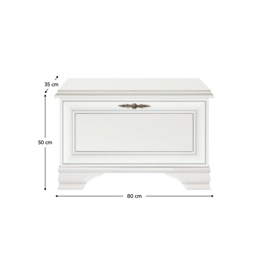Materiál: DTD laminovaná Barva: alpská bílá Rozměry (ŠxHxV): 80x35x50 cm Tloušťka materiálu: 1,6 cm Kovové úchytky Barva úchytek: antické stříbro Skříňka s výklopem Na nožičkách Výška nožiček: 8 cm Dodáváno v demontu