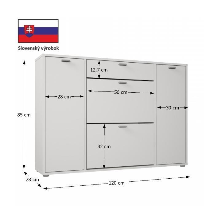 Materiál: MDF / dřevotříska Barva: šedá / bílá Rozměry (ŠxHxV): 53,5x24x117 cm 3-řadový Nosnost: 75 kg Vhodný na 12 párů bot výklopné šuplíky S úchytkami Dodávané v demontu Hmotnost: 19.5kg
