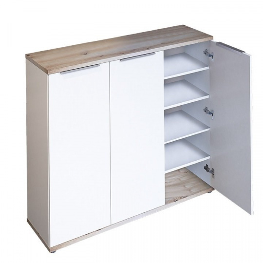 Botník, MODINI TYP 2 Materiál: DTD laminovaná / kov Barva: bílá / dub artisan Rozměry (ŠxHxV): 120x35x105 cm Tloušťka materiálu: 16/22 mm Třídveřová. Tři policové skříňky. Kovové úchytky. Dodávané v demontu.