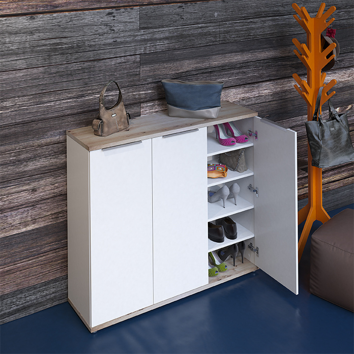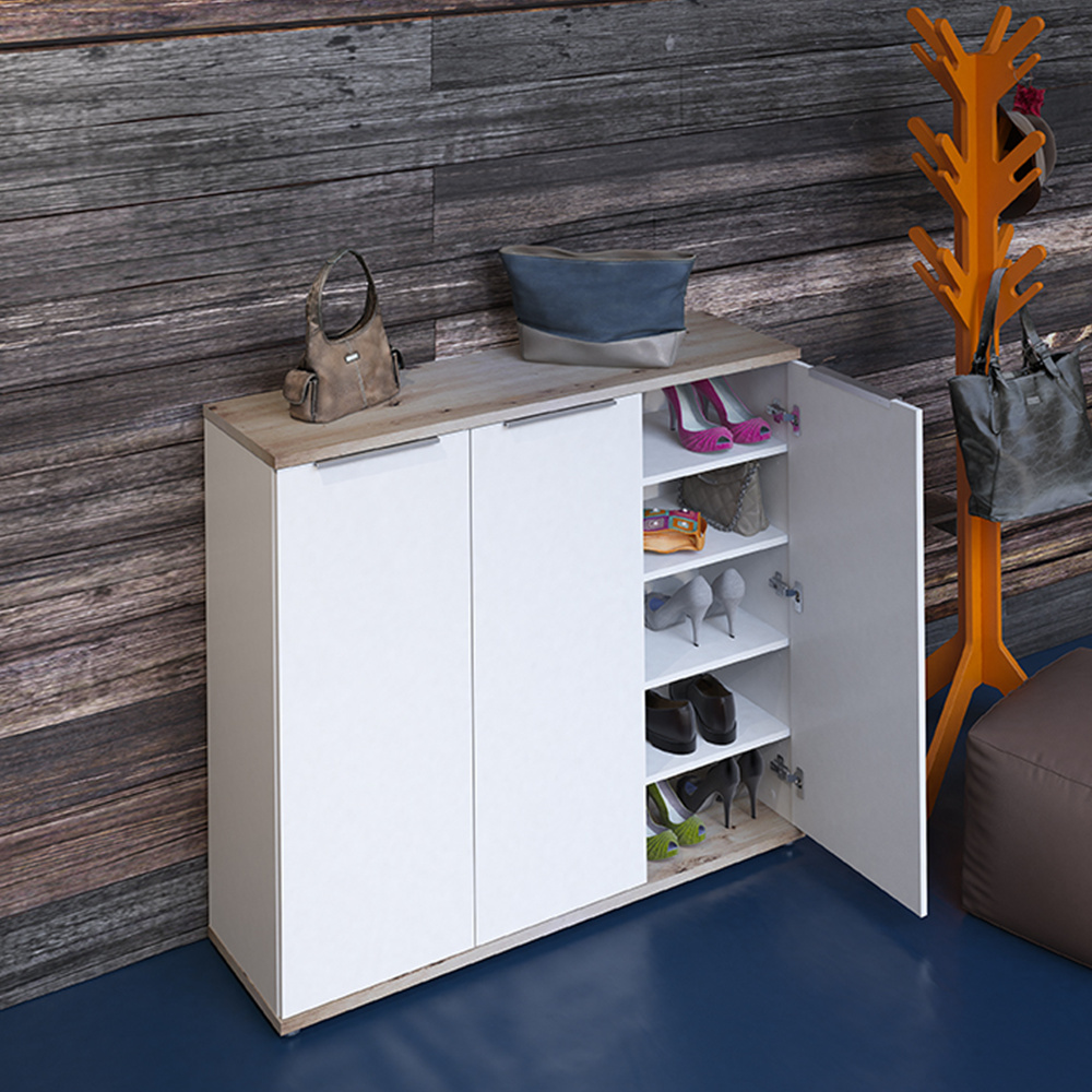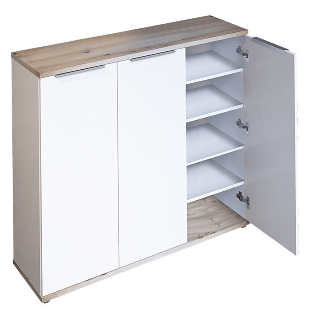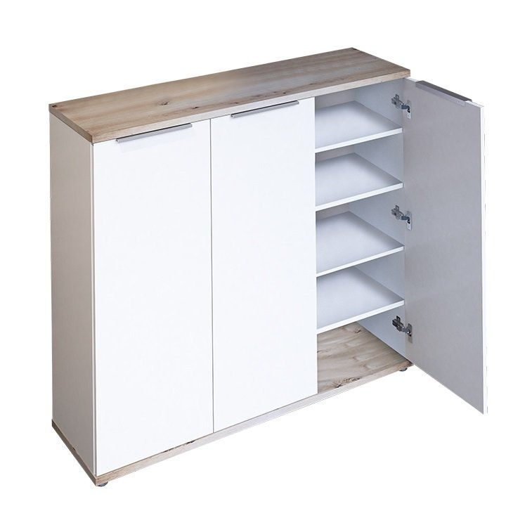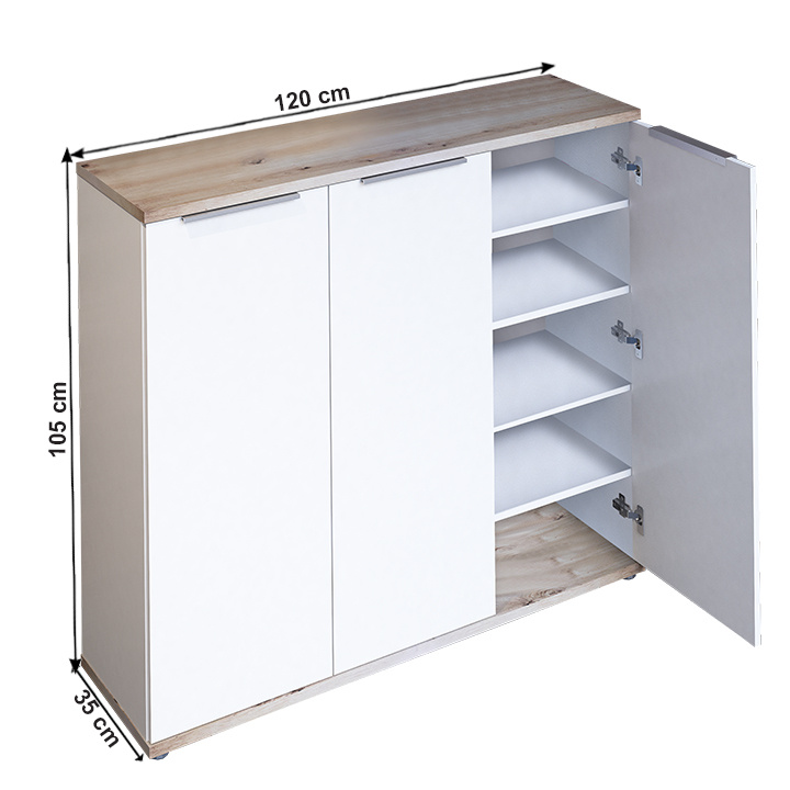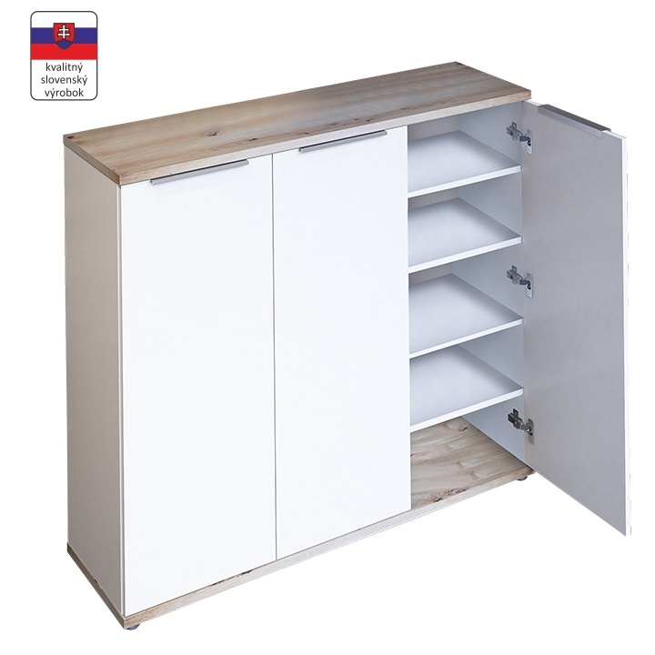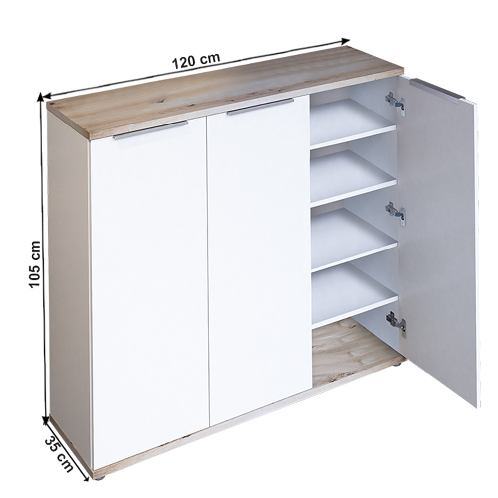 Botník, MODINI TYP 2 Materiál: DTD laminovaná / kov Barva: bílá / dub artisan Rozměry (ŠxHxV): 120x35x105 cm Tloušťka materiálu: 16/22 mm Třídveřová. Tři policové skříňky. Kovové úchytky. Dodávané v demontu.