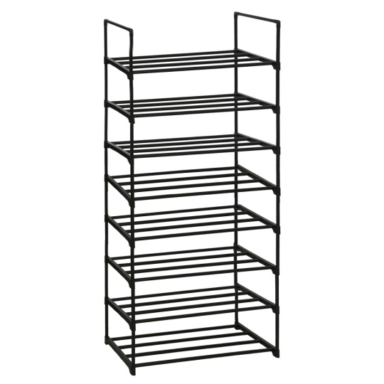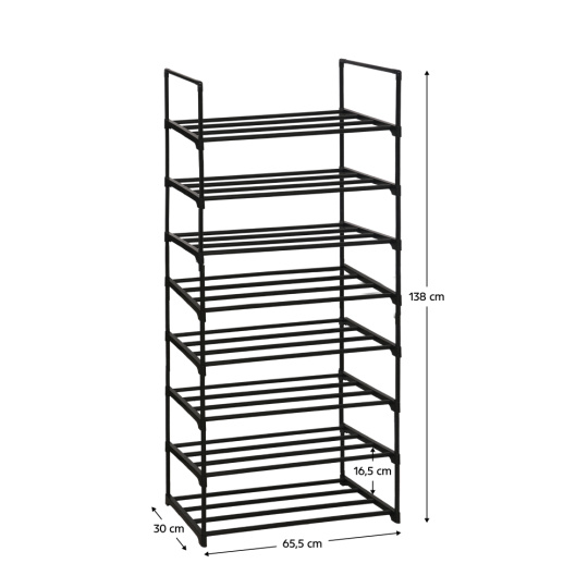 Materiál konstrukce: kov/plast Barva: černá Rozměry (ŠxHxV): 65,5x30x138 cm 8-řadý botník Výška mezi policemi: 16,5 cm Nosnost na polici: 5 kg Jednoduchý a praktický Stabilní konstrukce Jednoduchá montáž Snadná údržba Dodáváno v demontu