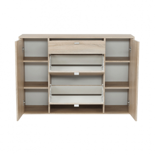 Výklopný dvouřadý botník IZABELA Materiálové provedení: DTD laminovaná Barevné provedení: dub sonoma Rozměry ŠxHxV: 95x28x90 cm Tloušťka materiálu: 16 mm Dodávané v demontu. Hmotnost: 29kg