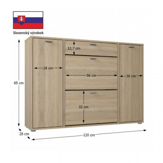 botník Anabela Materiálové provedení: DTD laminovaná Barevné provedení: dub sonoma Rozměry ŠxHxV: 120x28x85 cm Tloušťka materiálu korpus: 16/10 mm Dodávané v demontu.