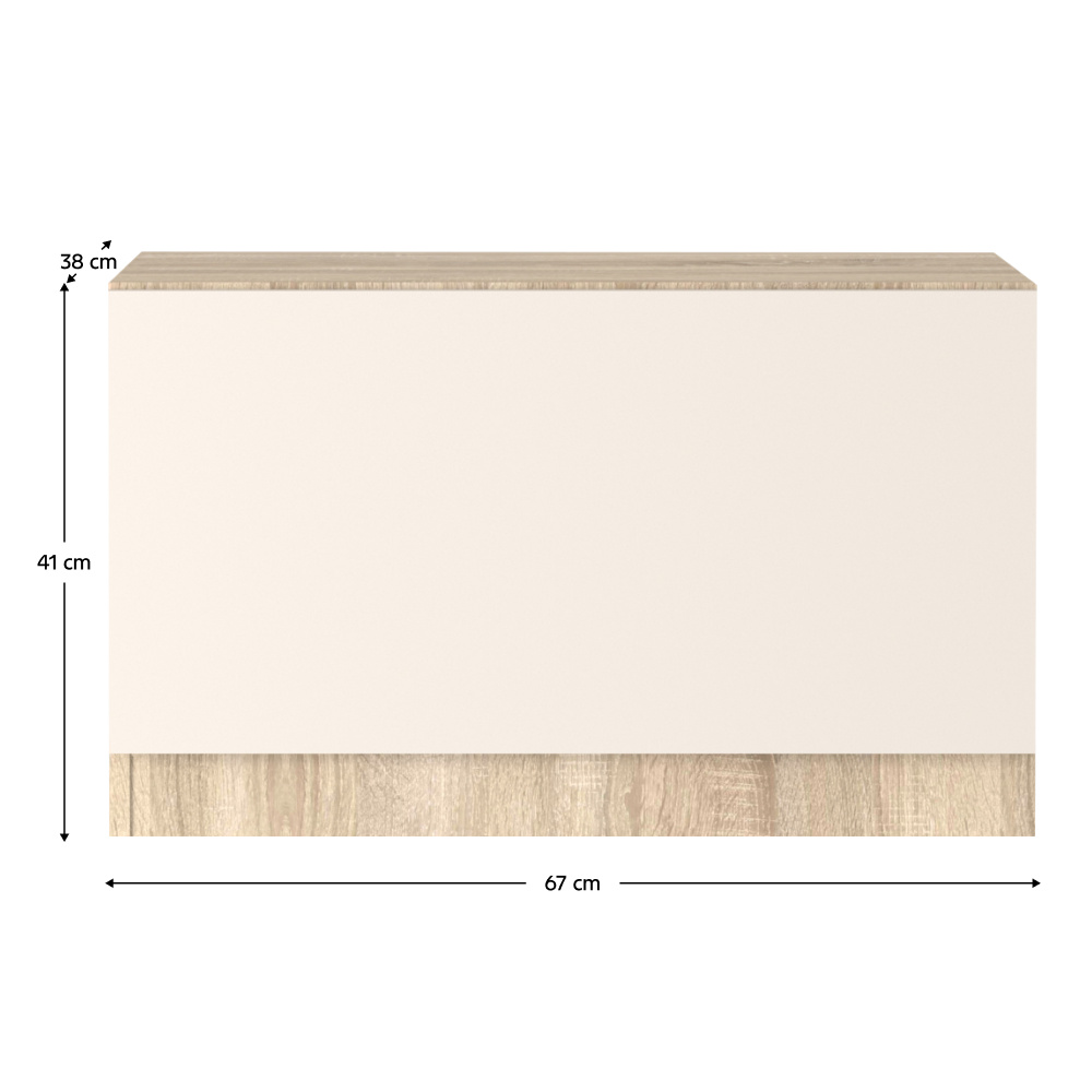 Materiál: laminovaná DTD Barva: dub sonoma/kašmír Rozměry (ŠxHxV): 67x38x41 cm Tloušťka materiálu DTD: 1,6-2,2 cm Nosnost vrchní desky: 35 kg Výklopná skříňka Police Nosnost police: 5 kg Plnovýsuvné kuličkové ložisko Hrana: papír impregnovaný termosetovými polymery Tloušťka DTD zadní strana: 0,3 cm Barva zadní strana: dub sonoma Bez úchytek Systém dotykového otevírání PUSH UP Plastové kluzáky Moderní design Dodáváno v demontu