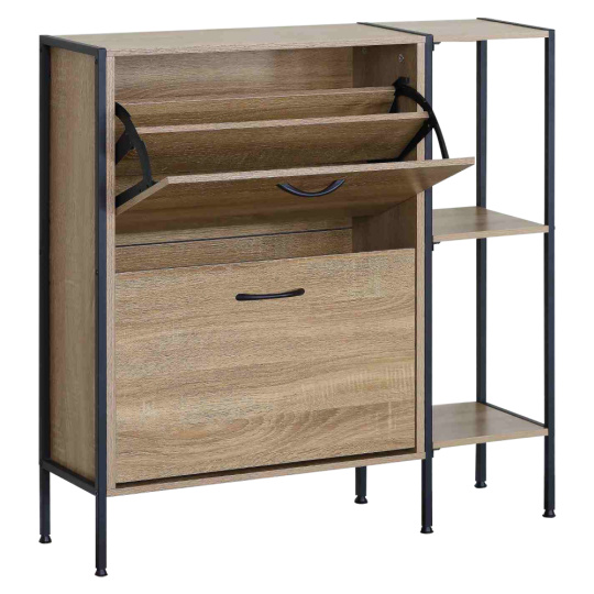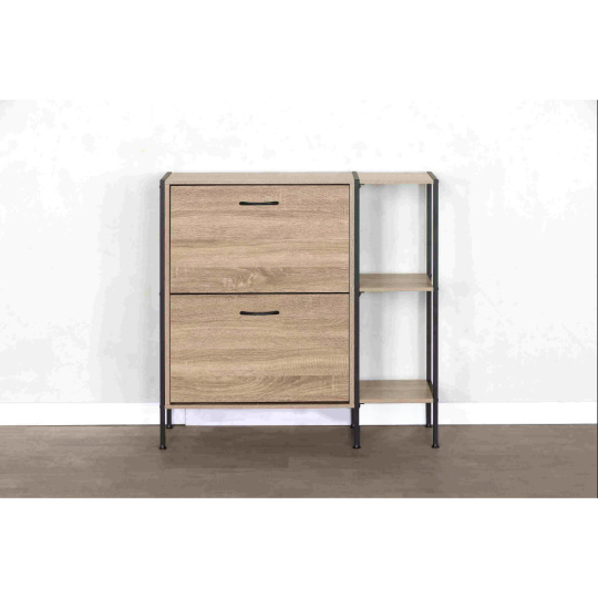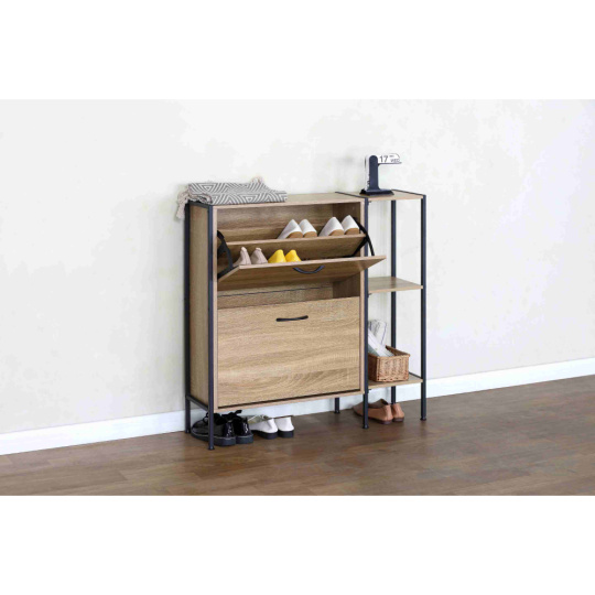 Materiál: dřevotříska/ocel/plast Barva: dub/černá Rozměry (ŠxHxV): 88x24x87 cm Tloušťka materiálu: 1,2-1,5 cm Na nožičkách Dva výklopné šuplíky Šuplík rozdělený na 2 části Rozměry výklopného šuplíku (ŠxV): 56,4x34,5 cm Nosnost výklopného šuplíku: 6 kg Police Nosnost vrchní desky: 10 kg Moderní design Praktický Dodáváno v demontu