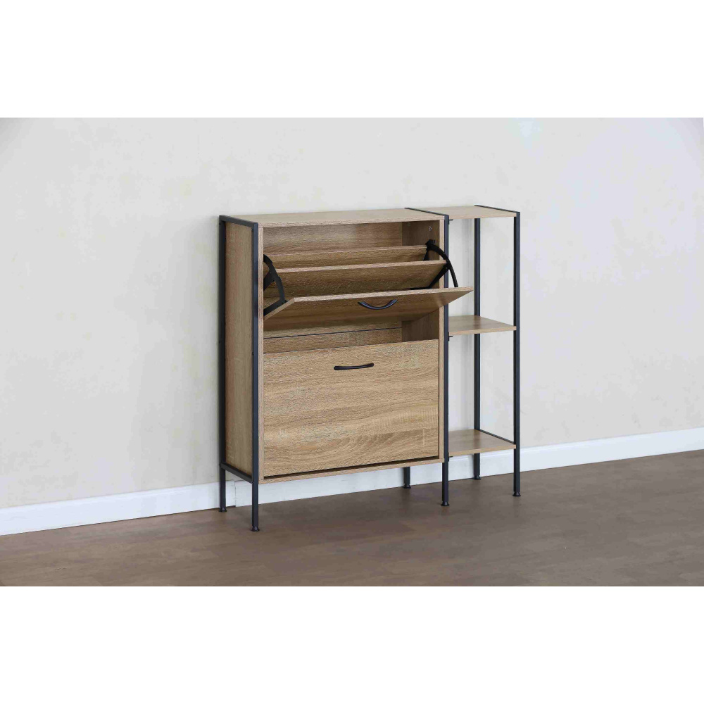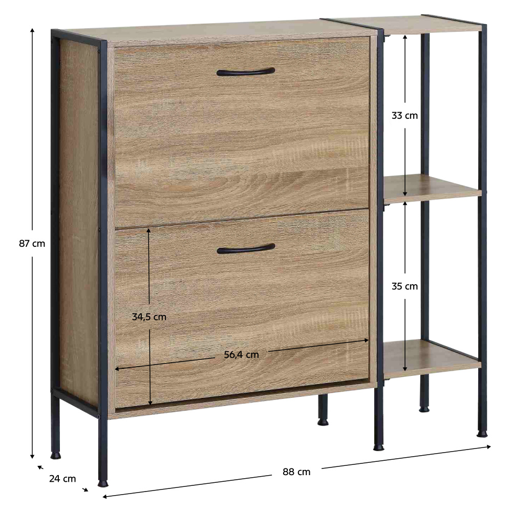 Materiál: dřevotříska/ocel/plast Barva: dub/černá Rozměry (ŠxHxV): 88x24x87 cm Tloušťka materiálu: 1,2-1,5 cm Na nožičkách Dva výklopné šuplíky Šuplík rozdělený na 2 části Rozměry výklopného šuplíku (ŠxV): 56,4x34,5 cm Nosnost výklopného šuplíku: 6 kg Police Nosnost vrchní desky: 10 kg Moderní design Praktický Dodáváno v demontu