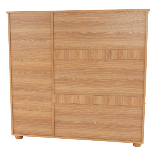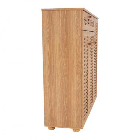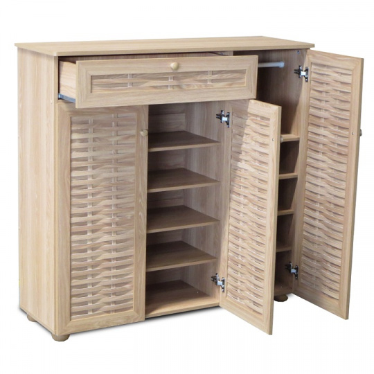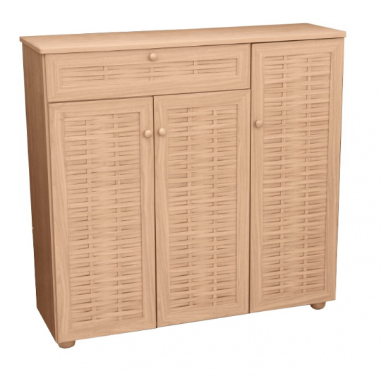 Materiál: MDF laminovaná Barva: natural Rozměry (ŠxHxV): 114,8x36,8x110,2 cm Rozměry šuplíku (ŠxHxV): 74x36,8x12,4 cm Třídveřový botník Se šuplíkem V pravé části 4 police V levé části věšáková tyč a 4 police Dodáváno v demontu