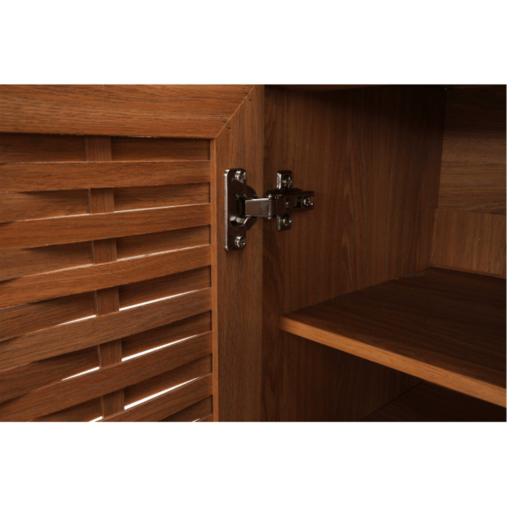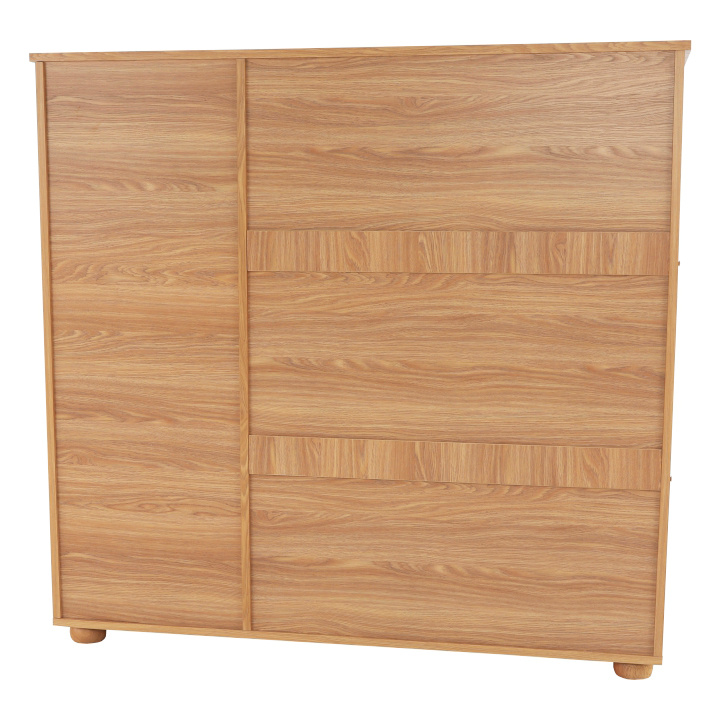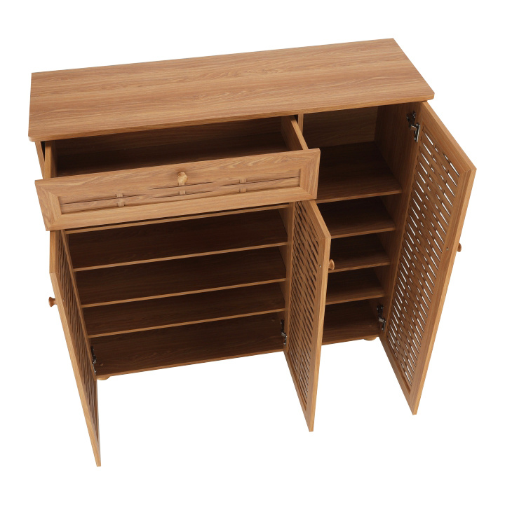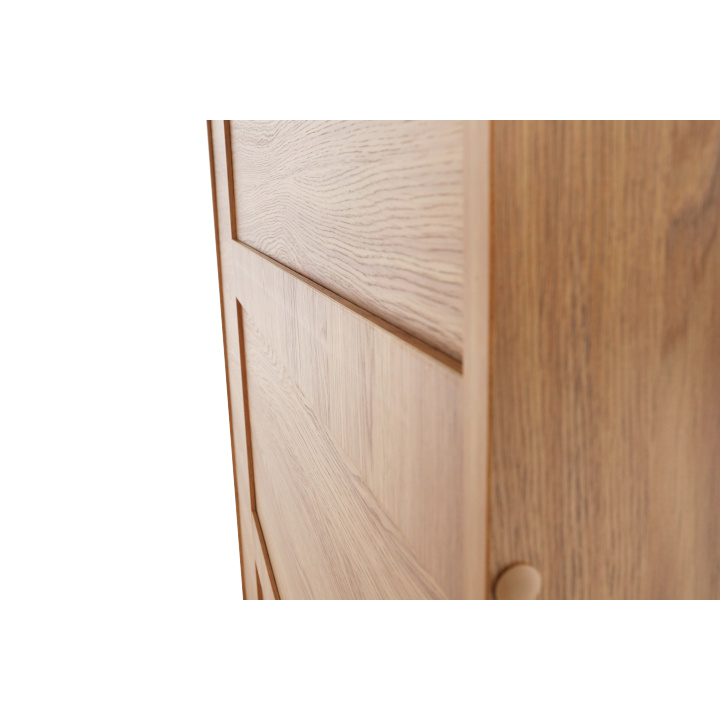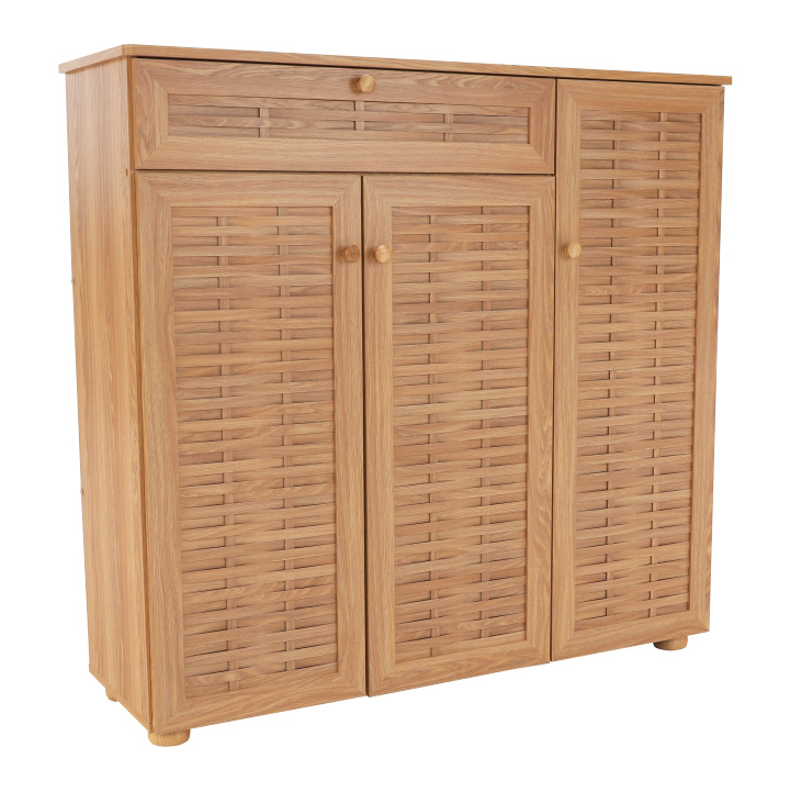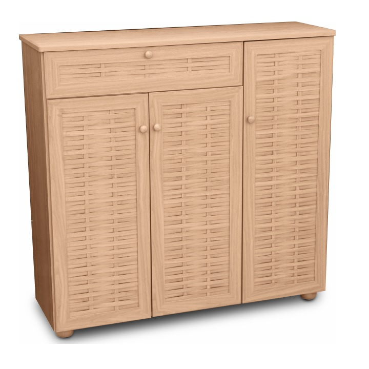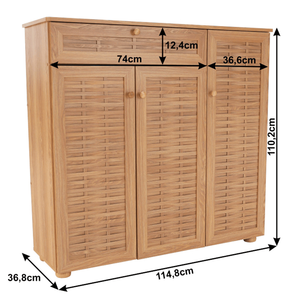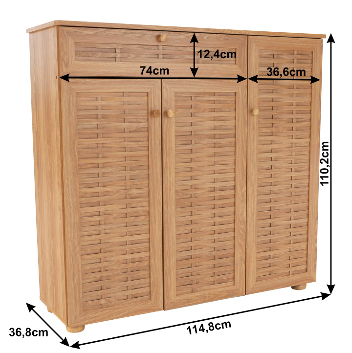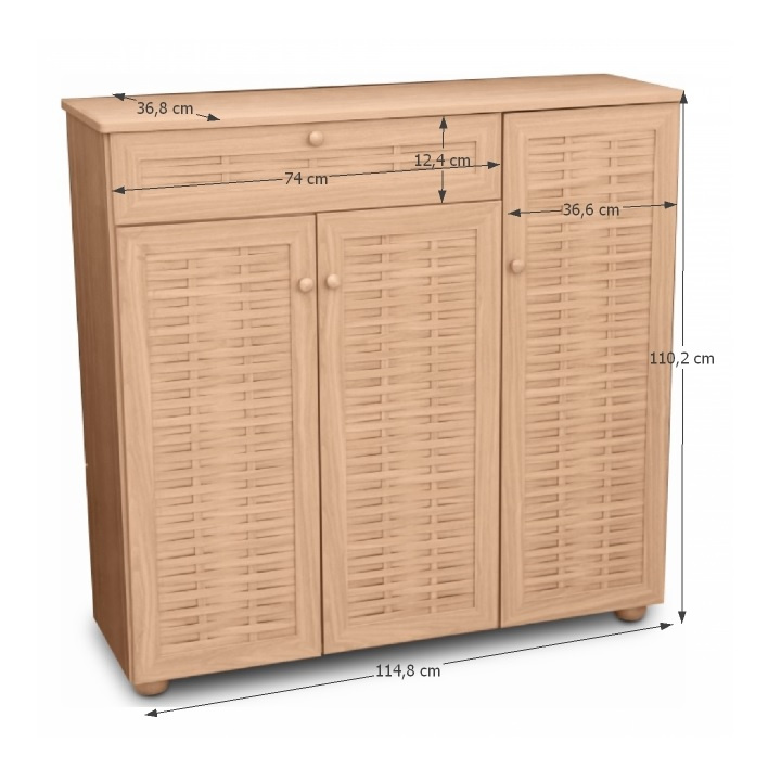 Materiál: MDF laminovaná Barva: natural Rozměry (ŠxHxV): 114,8x36,8x110,2 cm Rozměry šuplíku (ŠxHxV): 74x36,8x12,4 cm Třídveřový botník Se šuplíkem V pravé části 4 police V levé části věšáková tyč a 4 police Dodáváno v demontu