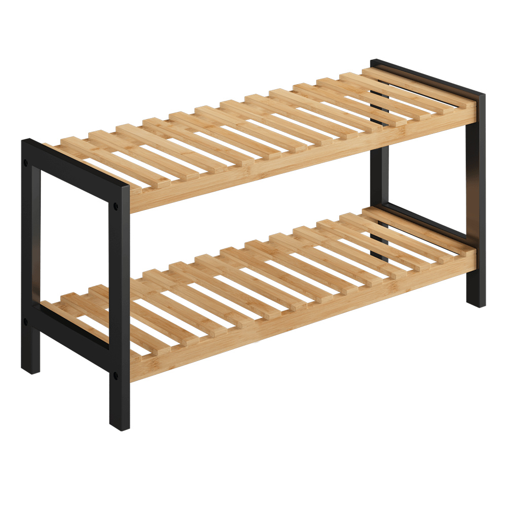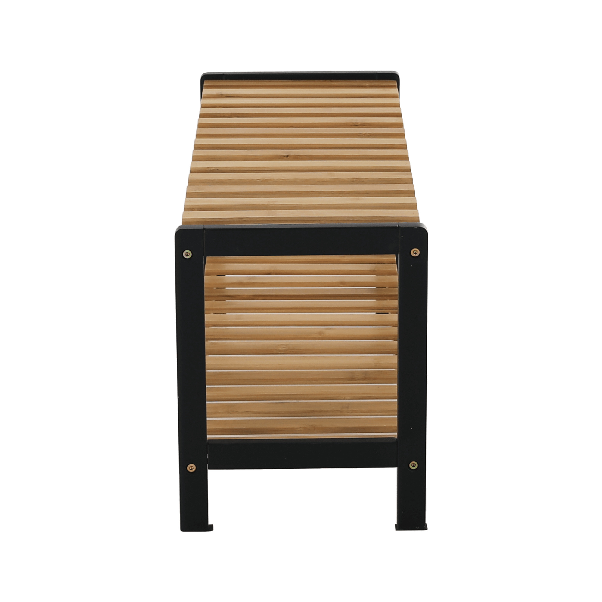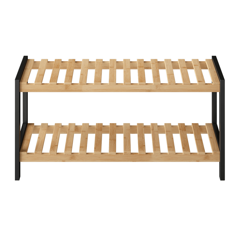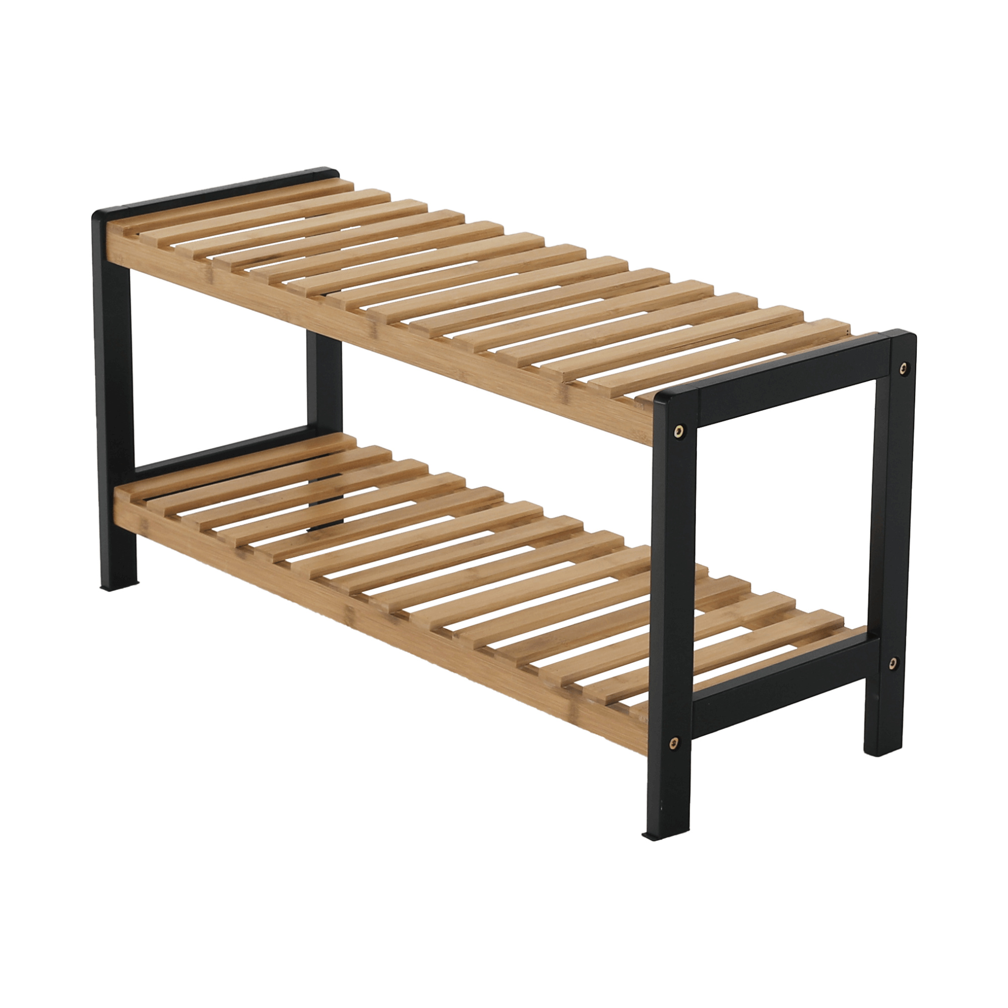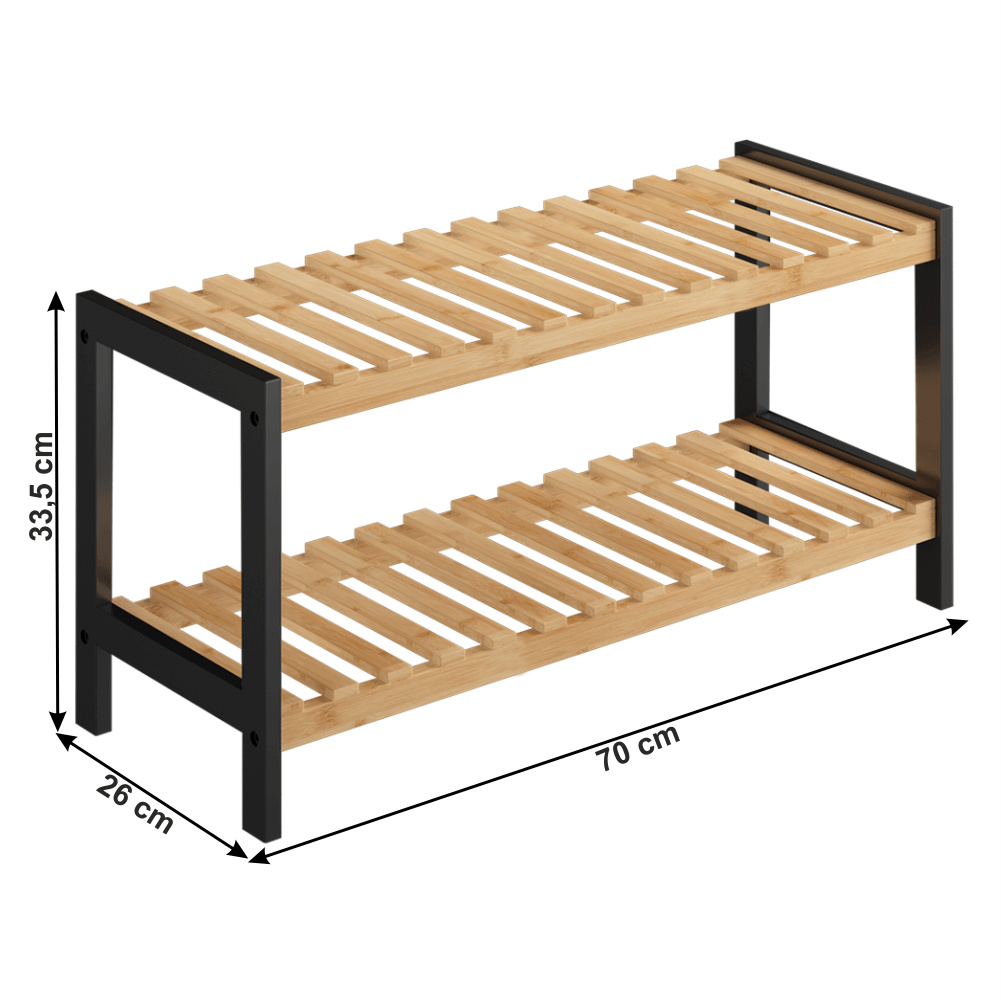 Materiál nohy: MDF Barva: černá Materiál odkládací část: lakovaný bambus Barva: přírodní Rozměry (ŠxHxV): 70x26x33,5 cm Nosnost: 20 kg 2-řadový dvě police Otevřený úložný prostor Dodávané v demontu