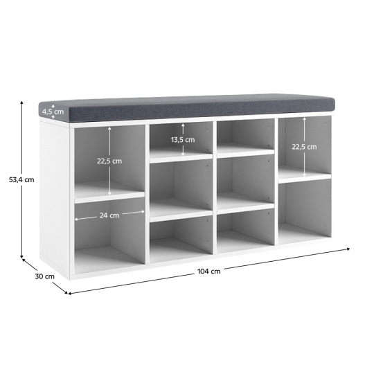 Materiál: DTD laminovaná Barva: bílá Rozměry (ŠxHxV): 104x30x53,4 cm Rozměry většího boxu (ŠxV): 24x22,5 cm Výška menšího boxu: 13,5 cm S policemi Nosnost botníku: Max. 95 kg Nosnost police: Max. 10 kg Výška podušky: 3 cm Výplň: molitan Dodáván v demontu