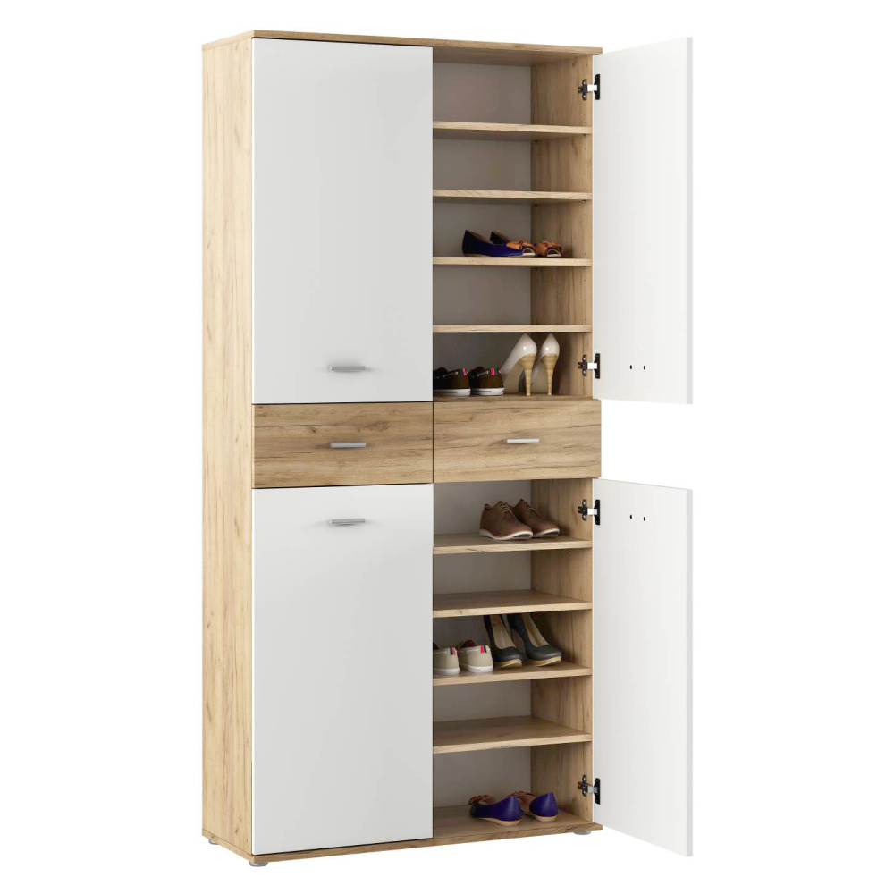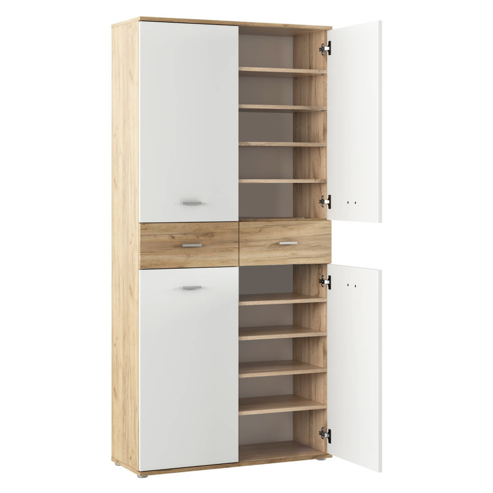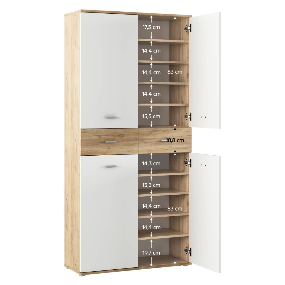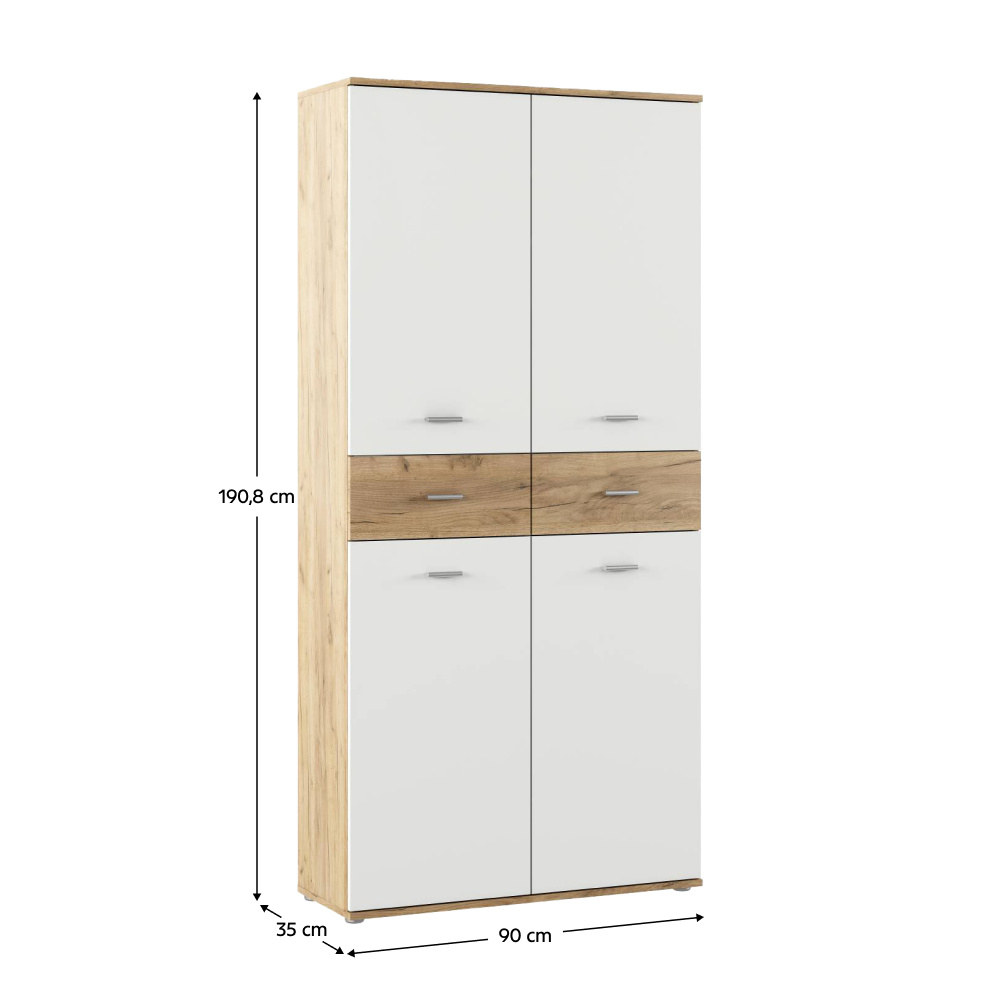 Materiál: DTD laminovaná Barva: bílá/dub artisan Rozměry (ŠxHxV): 90x35x190,8 Tloušťka materiálu: 1,6 cm Policový Nosnost police: 5 kg 2 zásuvky Rozměry zásuvky (ŠxV): 44,6x18,8 cm Nosnost zásuvky: 5 kg Dvoudveřový S úchytkami Materiál úchytek: PVC Barva úchytek: stříbrná Na kluzácích Praktický Víceúčelový Kvalitní slovenský výrobek Doporučujeme připevnit ke zdi Dodáváno v demontu