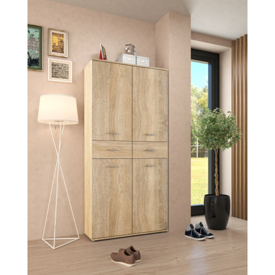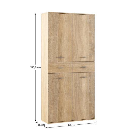 Materiál: DTD laminovaná Barva: dub sonoma Rozměry (ŠxHxV): 90x35x190,8 Tloušťka materiálu: 1,6 cm Policový Nosnost police: 5 kg 2 zásuvky Rozměry zásuvky (ŠxV): 44,6x18,8 cm Nosnost zásuvky: 5 kg Dvoudveřový S úchytkami Materiál úchytek: PVC Barva úchytek: stříbrná Na kluzácích Praktický Víceúčelový Kvalitní slovenský výrobek Doporučujeme připevnit ke zdi Dodáváno v demontu