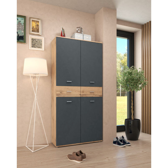 Materiál: DTD laminovaná Barva: grafit/dub wotan Rozměry (ŠxHxV): 90x35x190,8 Tloušťka materiálu: 1,6 cm Policový Nosnost police: 5 kg 2 zásuvky Rozměry zásuvky (ŠxV): 44,6x18,8 cm Nosnost zásuvky: 5 kg Dvoudveřový S úchytkami Materiál úchytek: PVC Barva úchytek: stříbrná Na kluzácích Praktický Víceúčelový Kvalitní slovenský výrobek Doporučujeme připevnit ke zdi Dodáváno v demontu