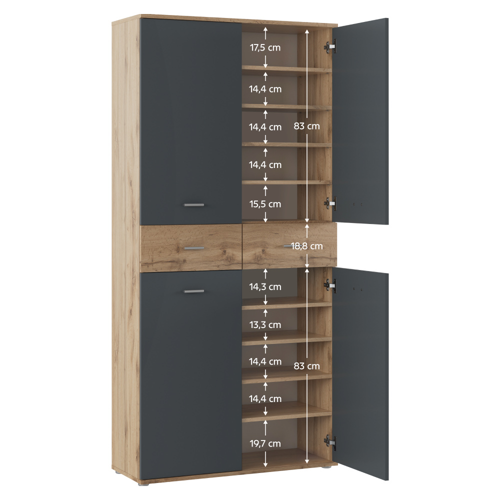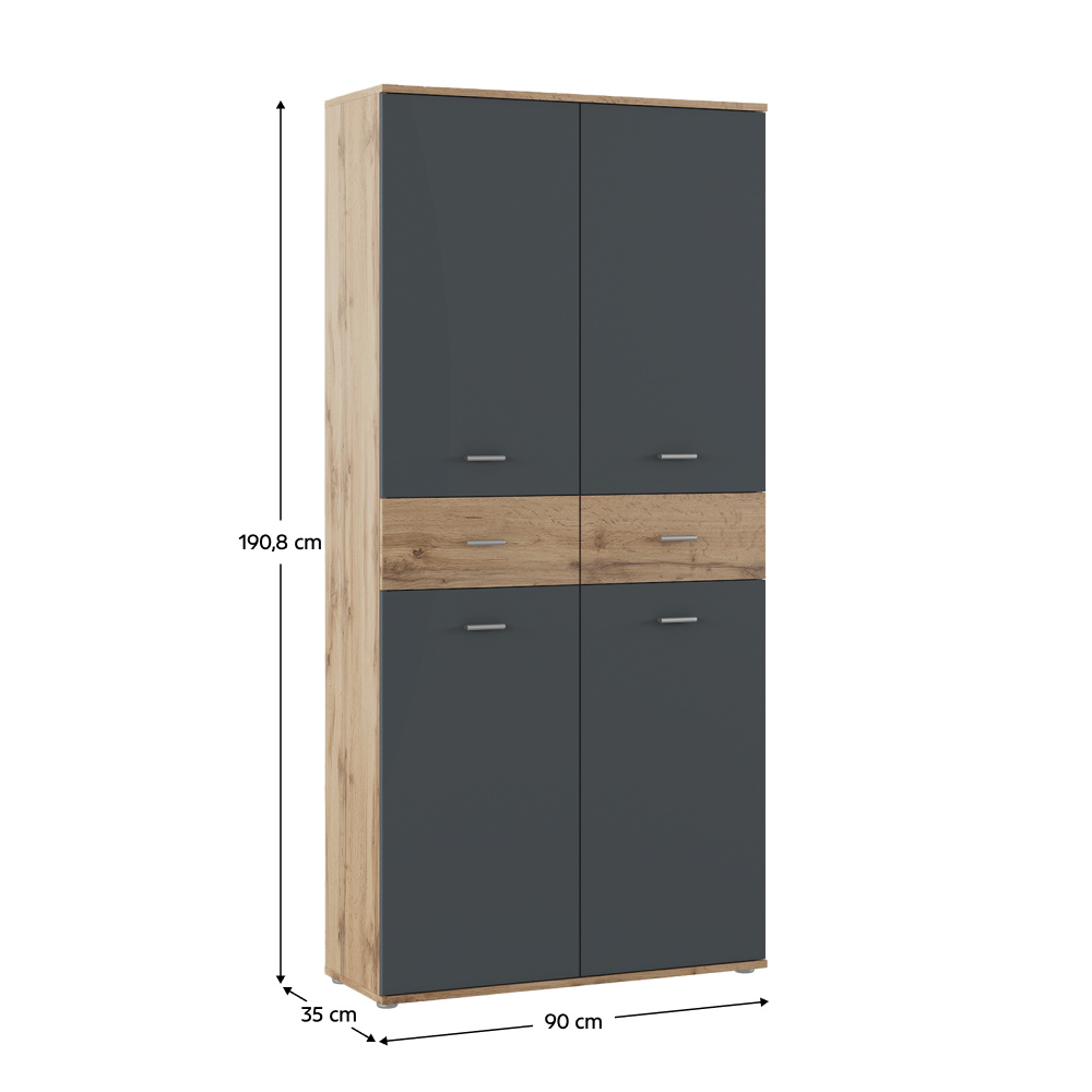 Materiál: DTD laminovaná Barva: grafit/dub wotan Rozměry (ŠxHxV): 90x35x190,8 Tloušťka materiálu: 1,6 cm Policový Nosnost police: 5 kg 2 zásuvky Rozměry zásuvky (ŠxV): 44,6x18,8 cm Nosnost zásuvky: 5 kg Dvoudveřový S úchytkami Materiál úchytek: PVC Barva úchytek: stříbrná Na kluzácích Praktický Víceúčelový Kvalitní slovenský výrobek Doporučujeme připevnit ke zdi Dodáváno v demontu