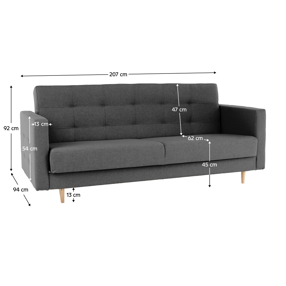 Materiál čalounění: látka NORN Oděruodolnost textilie podle testu Martindale: 50 000 oděrů Barva: 15 tmavě šedá Materiál nohy: dřevo Barva: natural Rozměry (ŠxHxV): 207x94x92 cm Rozkládací Plocha na spaní (ŠxD): 124x181 cm Hloubka sedu: 62 cm Výška sedu: 45 cm Výška spodního prostoru od podlahy: 13 cm Nosnost na osobu: 90 kg Výška zádové opěrky: 47 cm Rozměry opěrky na ruce (ŠxV): 13x54 cm S úložným prostorem Výplň sedáku bonelová pružina Dekorativní prošití Na nožičkách Skandinávský styl Možnost zakoupit si křeslo ve stejném provedení Dodávána v demontu
