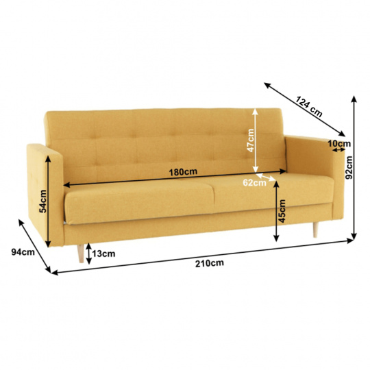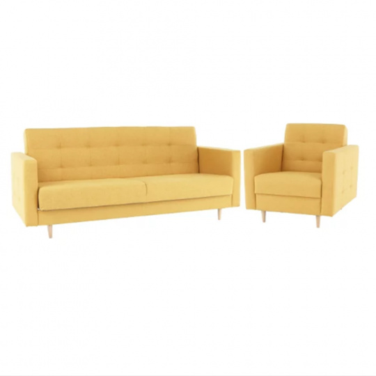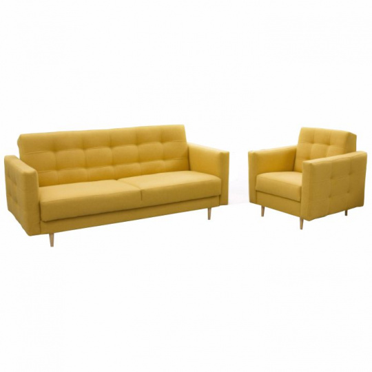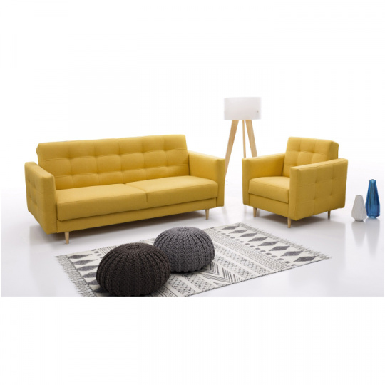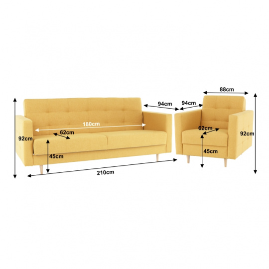 Materiál: látka NORN/dřevo Oděruodolnost textilie podle testu Martindale: 50 000 oděrů Barva: hořčicová/natural Sestava se skládá ze sedačky a dvou křesel Rozměry (ŠxHxV): 207x94x92 cm Plocha na spaní (ŠxD): 124x181 cm Rozměry křesla(ŠxHxV): 88x95x90 cm Hloubka sedu: 62 cm Výška sedu: 45 cm Výška zádové opěrky: 47 cm Rozměry opěrky na ruce (ŠxV): 13x54 cm Výška spodního prostoru od podlahy: 13 cm Nosnost na osobu: 90 kg S úložným prostorem Výplň sedáku bonelová pružina Dekorativní prošití Na nožičkách Skandinávský styl Dodávána v demontu