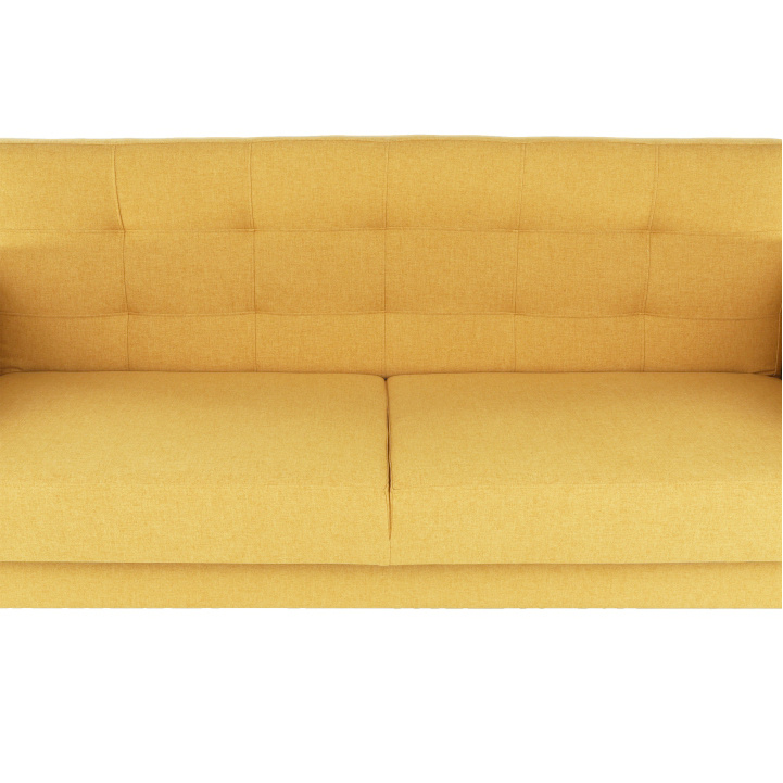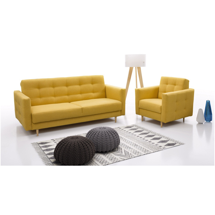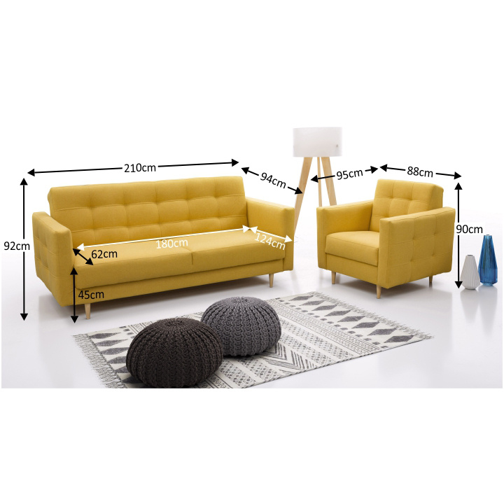 Materiál: látka NORN/dřevo Oděruodolnost textilie podle testu Martindale: 50 000 oděrů Barva: hořčicová/natural Sestava se skládá ze sedačky a dvou křesel Rozměry (ŠxHxV): 207x94x92 cm Plocha na spaní (ŠxD): 124x181 cm Rozměry křesla(ŠxHxV): 88x95x90 cm Hloubka sedu: 62 cm Výška sedu: 45 cm Výška zádové opěrky: 47 cm Rozměry opěrky na ruce (ŠxV): 13x54 cm Výška spodního prostoru od podlahy: 13 cm Nosnost na osobu: 90 kg S úložným prostorem Výplň sedáku bonelová pružina Dekorativní prošití Na nožičkách Skandinávský styl Dodávána v demontu
