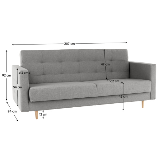 Materiál: látka NORN/dřevo Oděruodolnost textilie podle testu Martindale: 50 000 oděrů Barva: šedá/natural Rozměry (ŠxHxV): 207x94x92 cm Rozkládací Plocha na spaní (ŠxD): 124x181 cm Hloubka sedu: 62 cm Výška sedu: 45 cm Výška spodního prostoru od podlahy: 13 cm Nosnost na osobu: 90 kg Výška zádové opěrky: 47 cm Rozměry opěrky na ruce (ŠxV