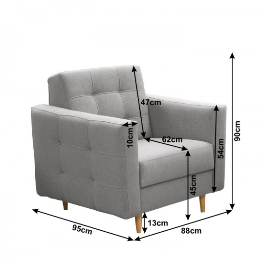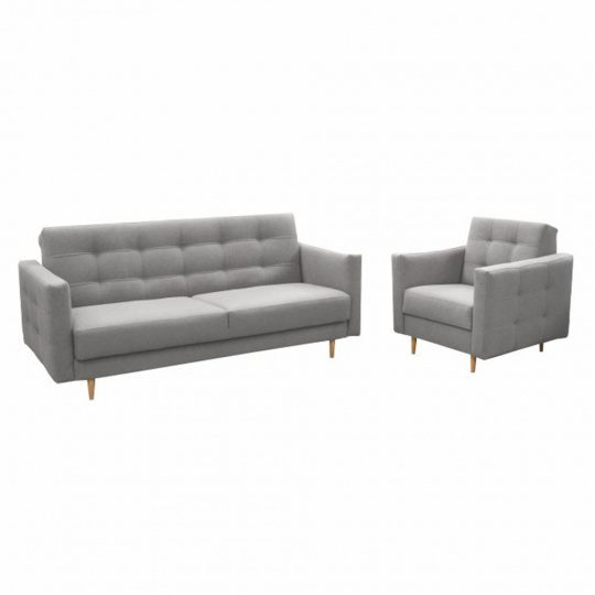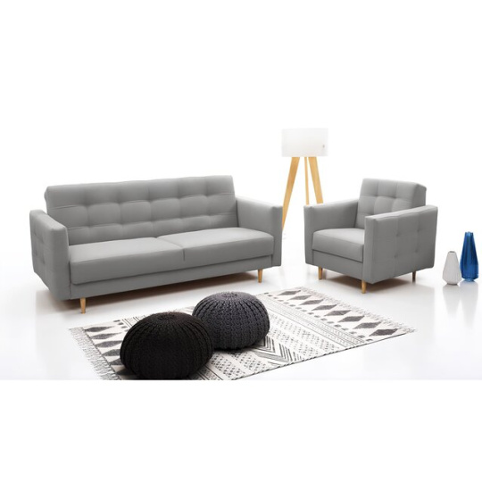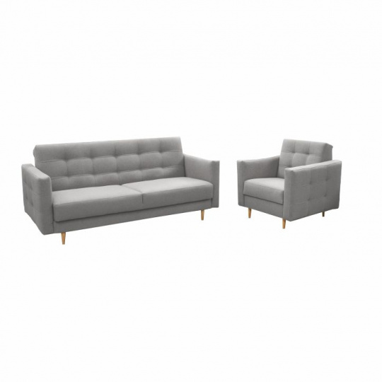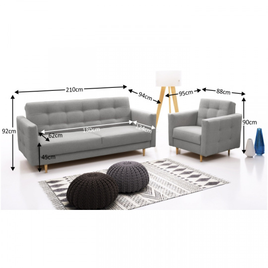 Materiál: látka NORN/dřevo Oděruodolnost textilie podle testu Martindale: 50 000 oděrů Barva: šedá/natural Sestava se skládá ze sedačky a dvou křesel Rozměry (ŠxHxV): 207x94x92 cm Plocha na spaní (ŠxD): 124x181 cm Rozměry křesla(ŠxHxV): 88x95x90 cm Hloubka sedu: 62 cm Výška sedu: 45 cm Výška spodního prostoru od podlahy: 13 cm Nosnost na osobu: 90 kg Výška zádové opěrky: 47 cm Rozměry opěrky na ruce (ŠxV): 13x54 cm S úložným prostorem Výplň sedáku bonelová pružina Dekorativní prošití Na nožičkách Skandinávský styl Dodávána v demontu