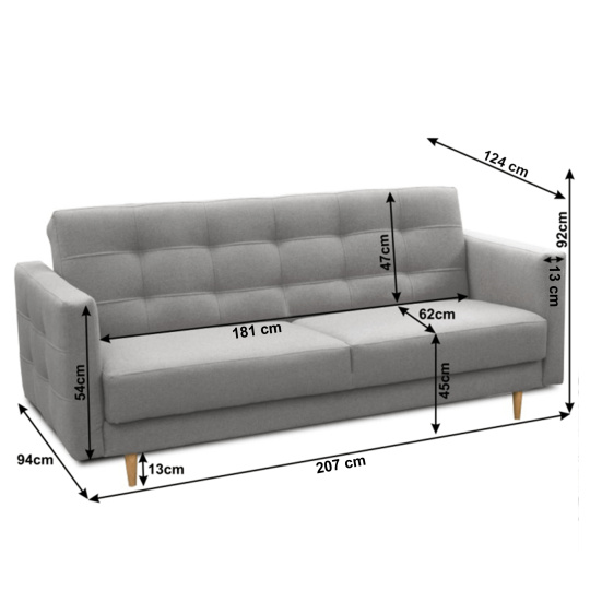Materiál čalounění: látka NORN Oděruodolnost textilie podle testu Martindale: 50 000 oděrů Barva: 15 tmavě šedá Materiál nohy: dřevo Barva: natural Rozměry (ŠxHxV): 207x94x92 cm Rozkládací Plocha na spaní (ŠxD): 124x181 cm Hloubka sedu: 62 cm Výška sedu: 45 cm Výška spodního prostoru od podlahy: 13 cm Nosnost na osobu: 90 kg Výška zádové