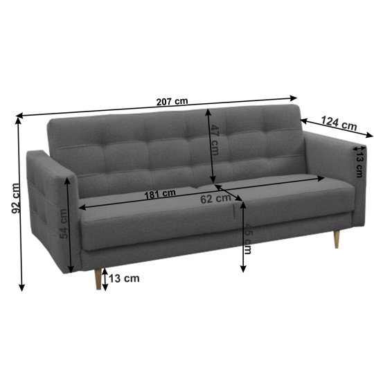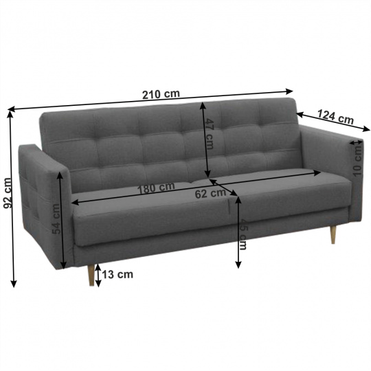 Materiál čalounění: látka NORN Oděruodolnost textilie podle testu Martindale: 50 000 oděrů Barva: 15 tmavě šedá Materiál nohy: dřevo Barva: natural Sestava se skládá ze sedačky a dvou křesel Rozměry (ŠxHxV): 207x94x92 cm Plocha na spaní (ŠxD): 124x181 cm Rozměry křesla(ŠxHxV): 88x95x90 cm Hloubka sedu: 62 cm Výška sedu: 45 cm Výška spodního prostoru od podlahy: 13 cm Výška zádové opěrky: 47 cm Rozměry opěrky na ruce (ŠxV): 13x54 cm Nosnost na osobu: 90 kg 3-sed s úložným prostorem Výplň sedáku bonelová pružina Dekorativní prošití Na nožičkách Skandinávský styl Dodávána v demontu