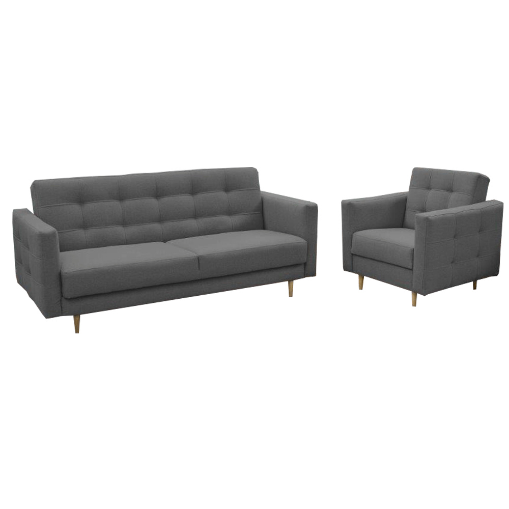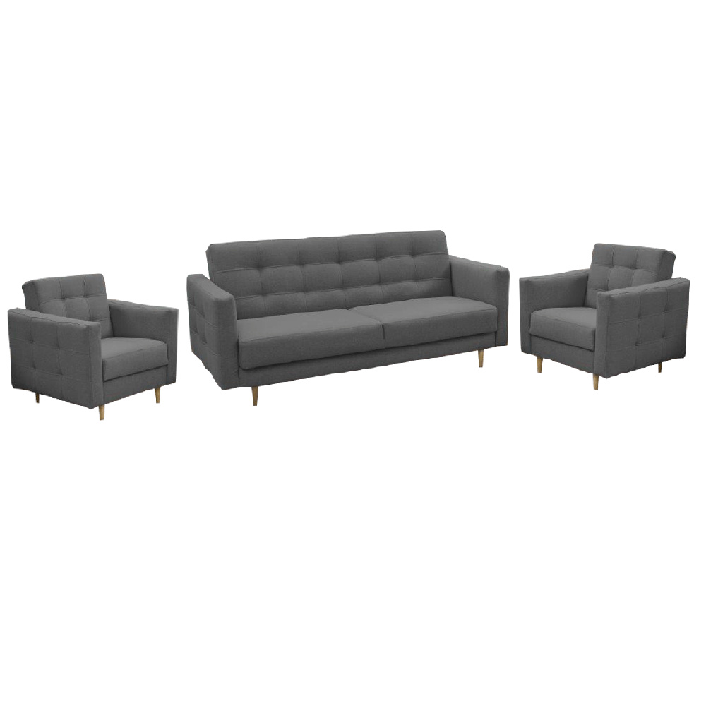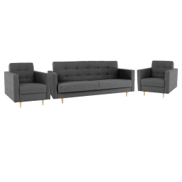 Materiál čalounění: látka NORN Oděruodolnost textilie podle testu Martindale: 50 000 oděrů Barva: 15 tmavě šedá Materiál nohy: dřevo Barva: natural Sestava se skládá ze sedačky a dvou křesel Rozměry (ŠxHxV): 207x94x92 cm Plocha na spaní (ŠxD): 124x181 cm Rozměry křesla(ŠxHxV): 88x95x90 cm Hloubka sedu: 62 cm Výška sedu: 45 cm Výška spodního prostoru od podlahy: 13 cm Výška zádové opěrky: 47 cm Rozměry opěrky na ruce (ŠxV): 13x54 cm Nosnost na osobu: 90 kg 3-sed s úložným prostorem Výplň sedáku bonelová pružina Dekorativní prošití Na nožičkách Skandinávský styl Dodávána v demontu