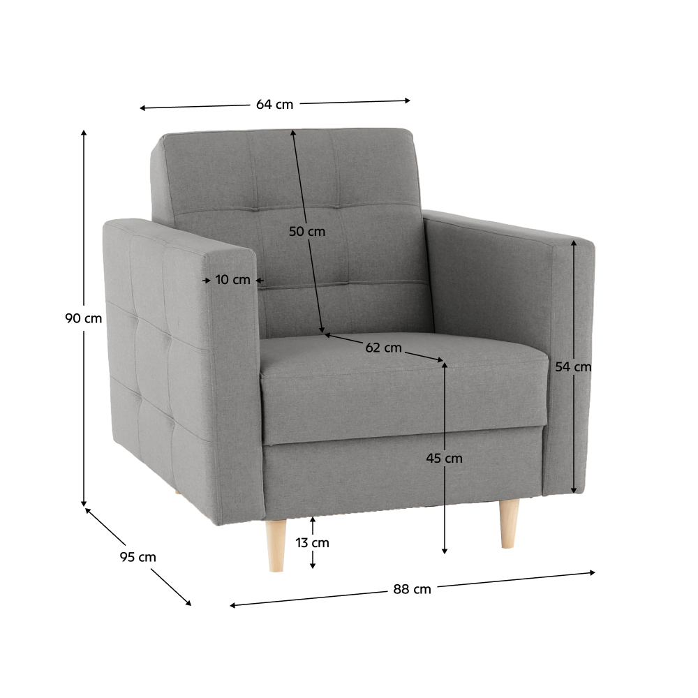 Materiál: látka NORN/dřevo Oděruodolnost textilie podle testu Martindale: 50 000 oděrů Barva: šedá/natural Sestava se skládá ze sedačky a dvou křesel Rozměry (ŠxHxV): 207x94x92 cm Plocha na spaní (ŠxD): 124x181 cm Rozměry křesla(ŠxHxV): 88x95x90 cm Hloubka sedu: 62 cm Výška sedu: 45 cm Výška spodního prostoru od podlahy: 13 cm Nosnost na