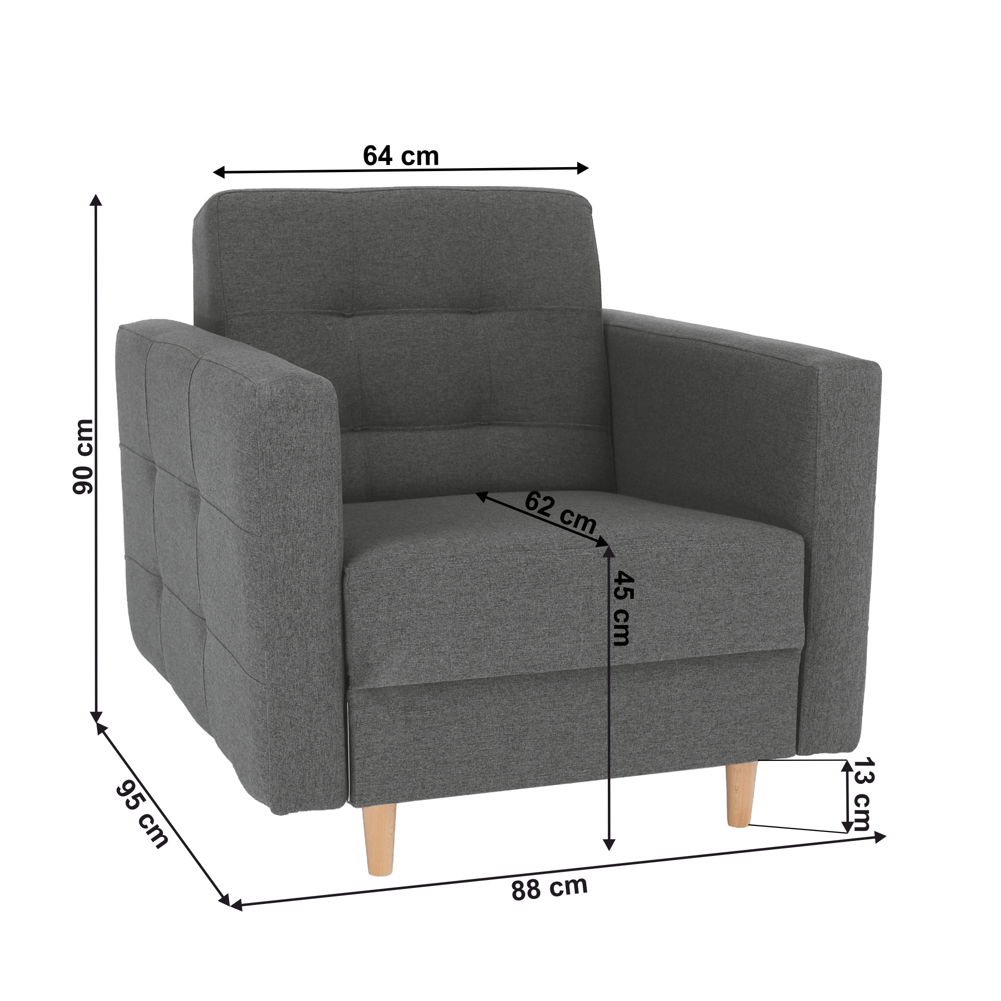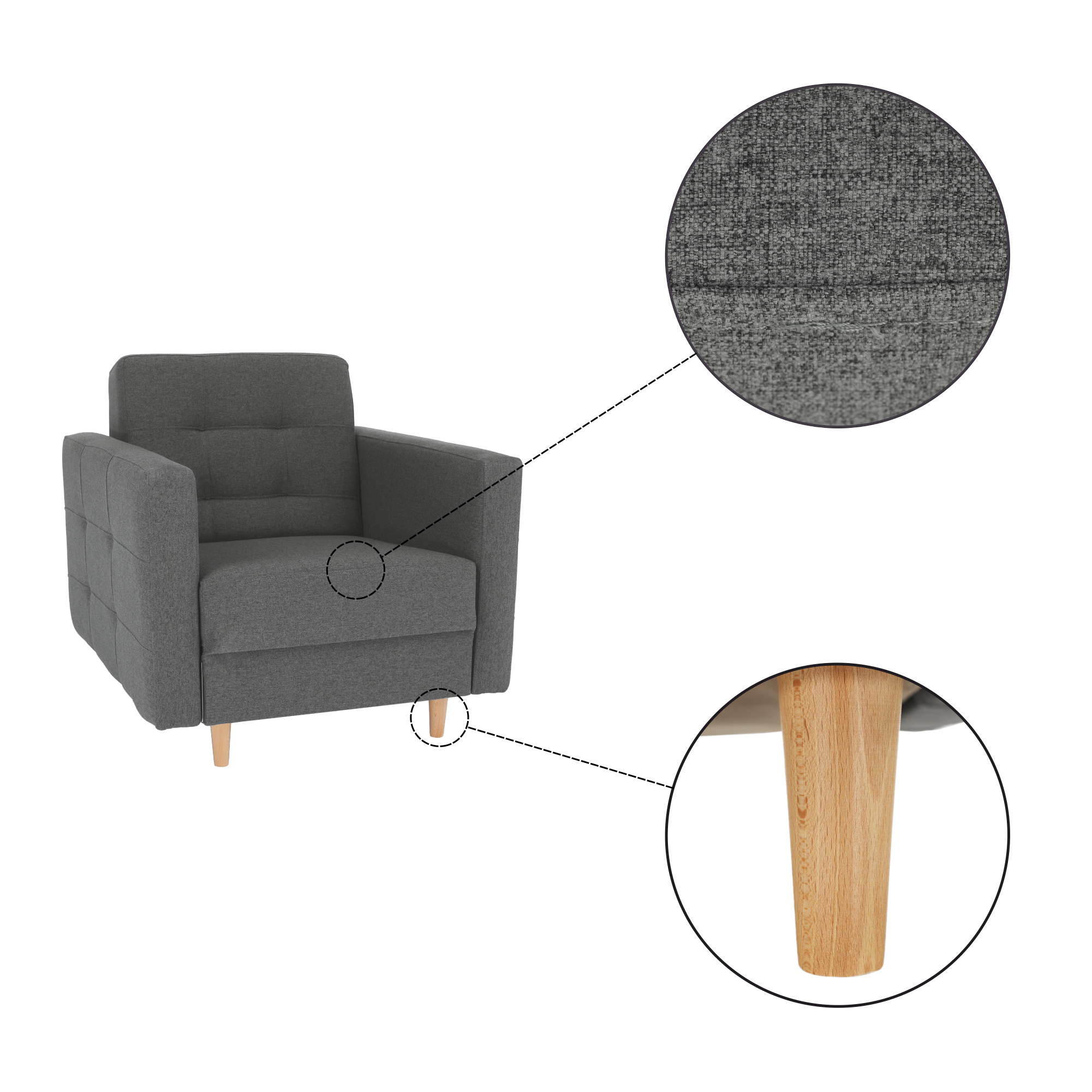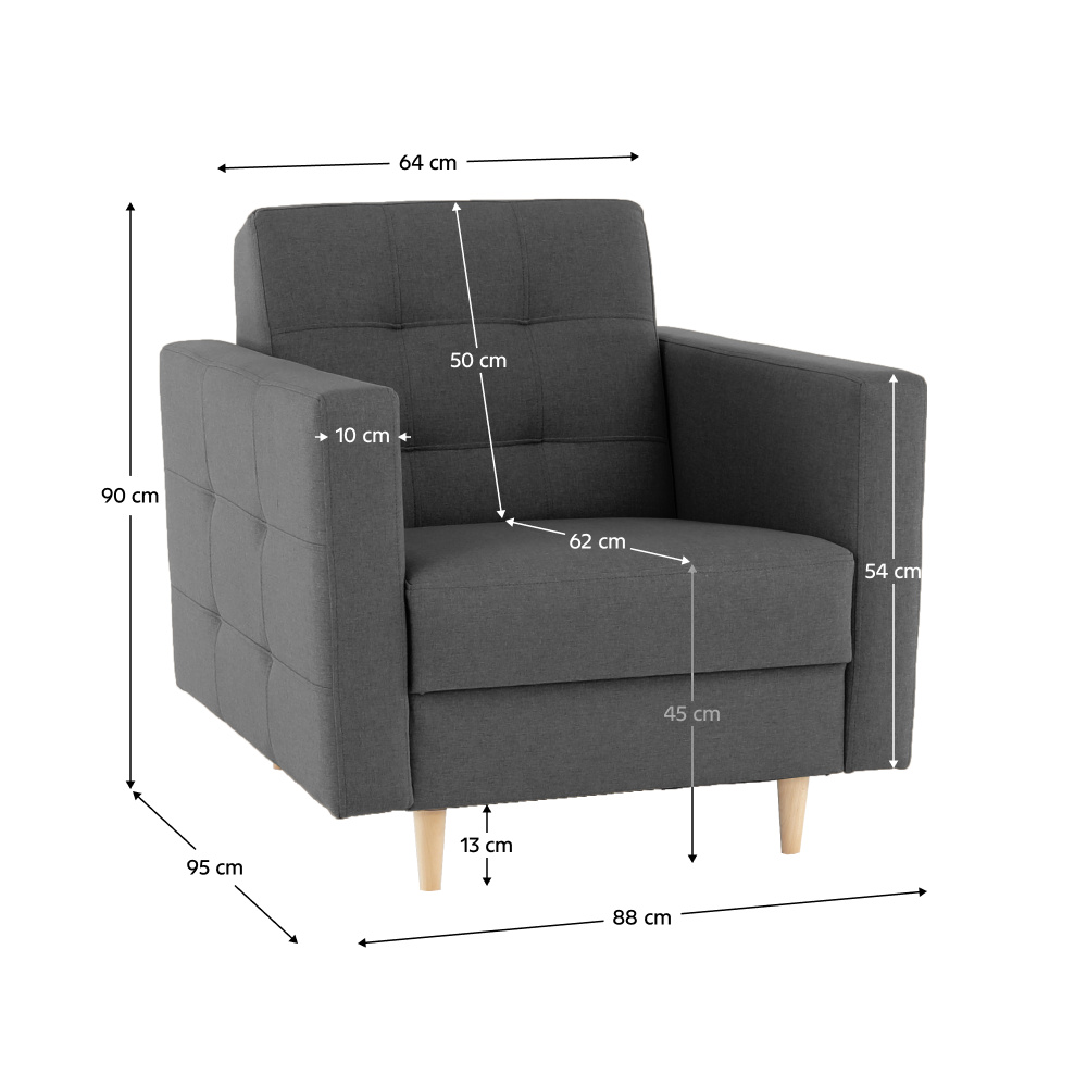 Celočalouněné křeslo AMEDIA Barva: tmavě šedá / natural Oděruodolnost textilie podle testu Martindale: 50 000 oděrek Materiál: látka Norn / dřevo Rozměry: (ŠxHxV): 88x95x90 cm Hloubka sedu: 62 cm Výška sedu: 45 cm Výška spodního prostoru od podlahy: 13 cm Nosnost na osobu: 90 kg