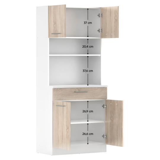 Materiál: laminovaná DTD Barva: bílá/dub sonoma Rozměry (ŠxHxV): 80x43,3x185 cm Tloušťka materiálu: 1,6 cm Tloušťka vrchního plátu spodní skříňky: 2,2 cm Čtyřdveřový Policový Nosnost police: 5 kg 1 zásuvka Rozměry zásuvky (ŠxV): 79,4x15 cm Nosnost zásuvky: 6 kg S úchytkami Materiál úchytek: PVC Barva úchytek: stříbrná Na kluzácích Praktický Víceúčelový Kvalitní slovenský výrobek Doporučujeme připevnit ke zdi Dodáváno v demontu