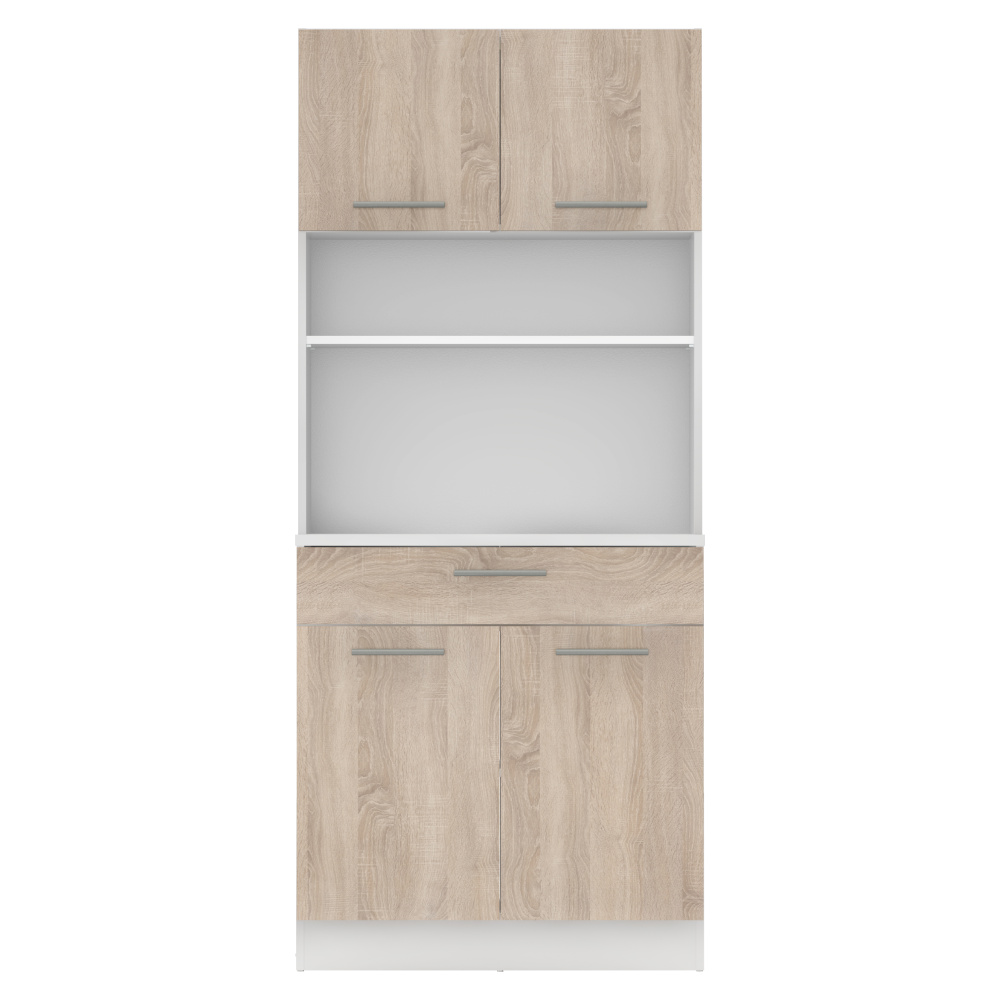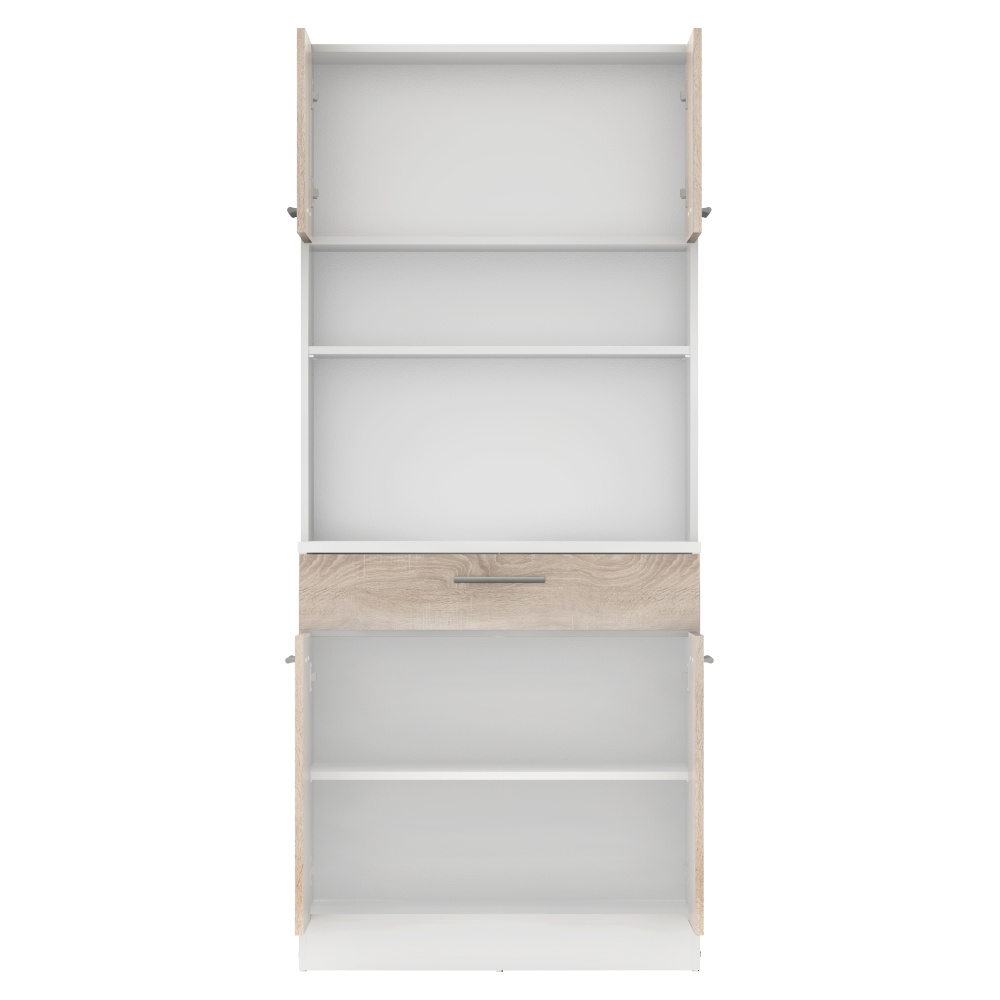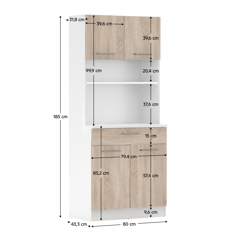 Materiál: laminovaná DTD Barva: bílá/dub sonoma Rozměry (ŠxHxV): 80x43,3x185 cm Tloušťka materiálu: 1,6 cm Tloušťka vrchního plátu spodní skříňky: 2,2 cm Čtyřdveřový Policový Nosnost police: 5 kg 1 zásuvka Rozměry zásuvky (ŠxV): 79,4x15 cm Nosnost zásuvky: 6 kg S úchytkami Materiál úchytek: PVC Barva úchytek: stříbrná Na kluzácích Praktický Víceúčelový Kvalitní slovenský výrobek Doporučujeme připevnit ke zdi Dodáváno v demontu
