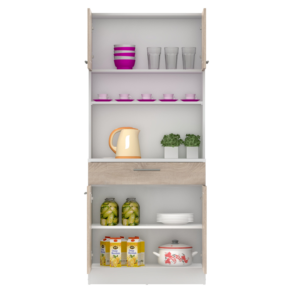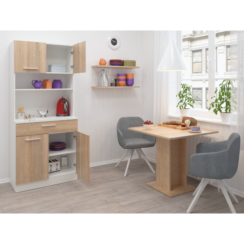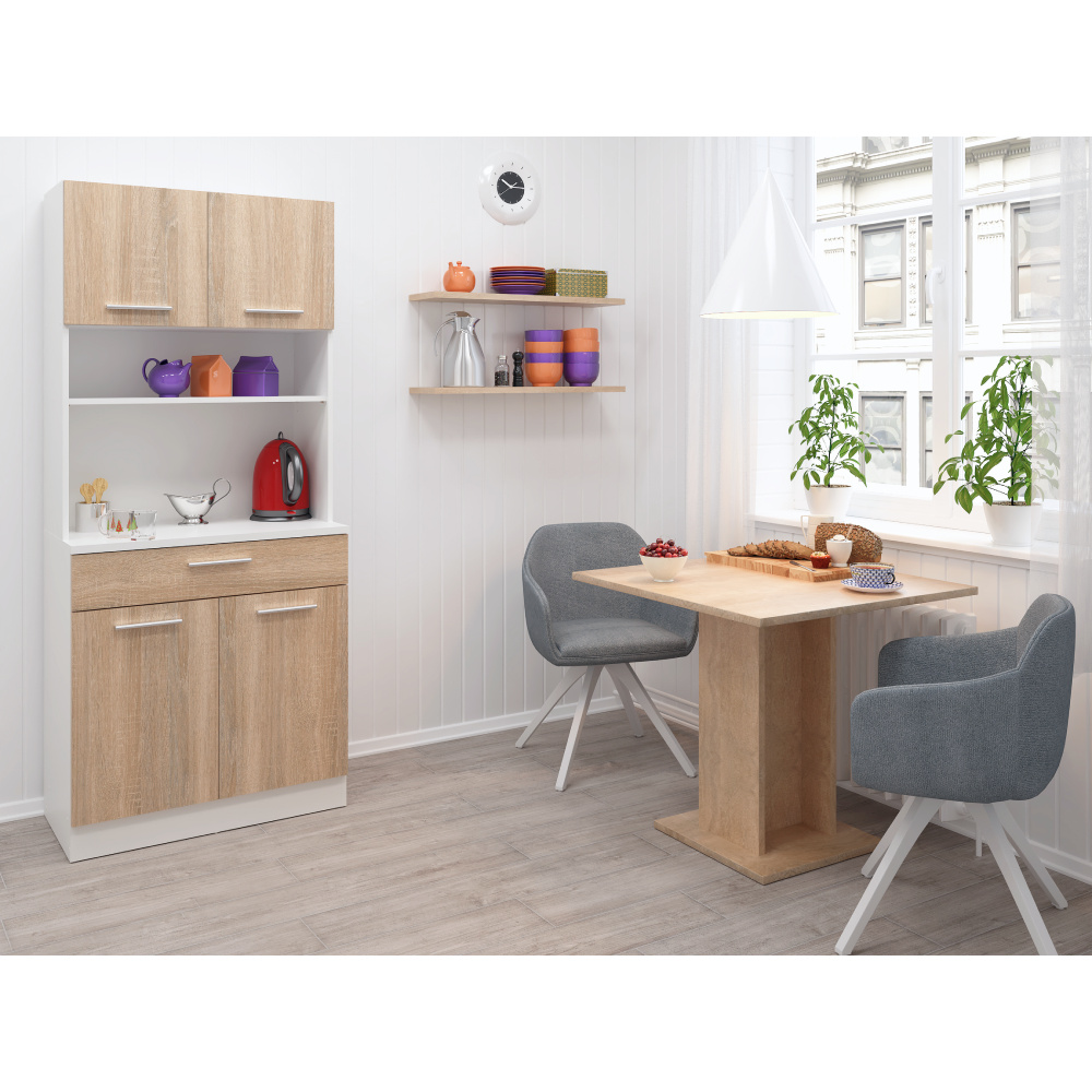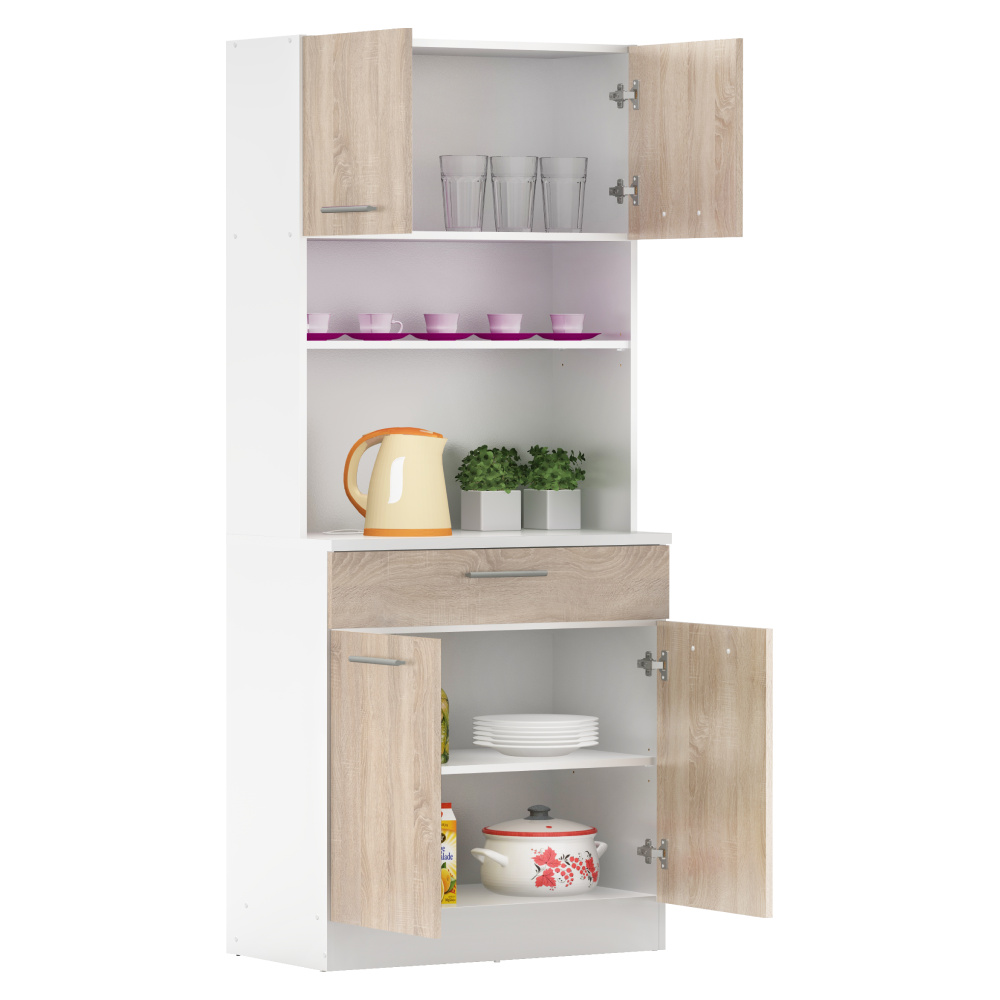 Materiál: laminovaná DTD Barva: bílá/dub sonoma Rozměry (ŠxHxV): 80x43,3x185 cm Tloušťka materiálu: 1,6 cm Tloušťka vrchního plátu spodní skříňky: 2,2 cm Čtyřdveřový Policový Nosnost police: 5 kg 1 zásuvka Rozměry zásuvky (ŠxV): 79,4x15 cm Nosnost zásuvky: 6 kg S úchytkami Materiál úchytek: PVC Barva úchytek: stříbrná Na kluzácích Praktický Víceúčelový Kvalitní slovenský výrobek Doporučujeme připevnit ke zdi Dodáváno v demontu