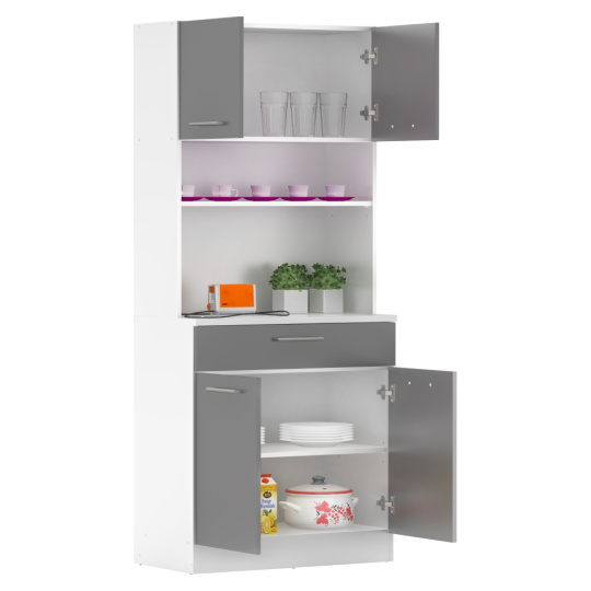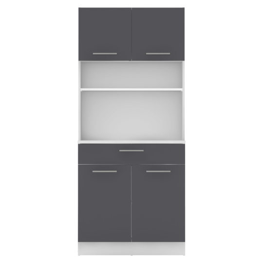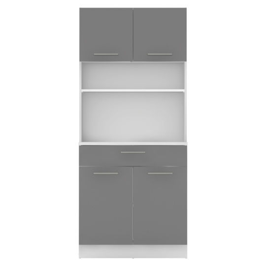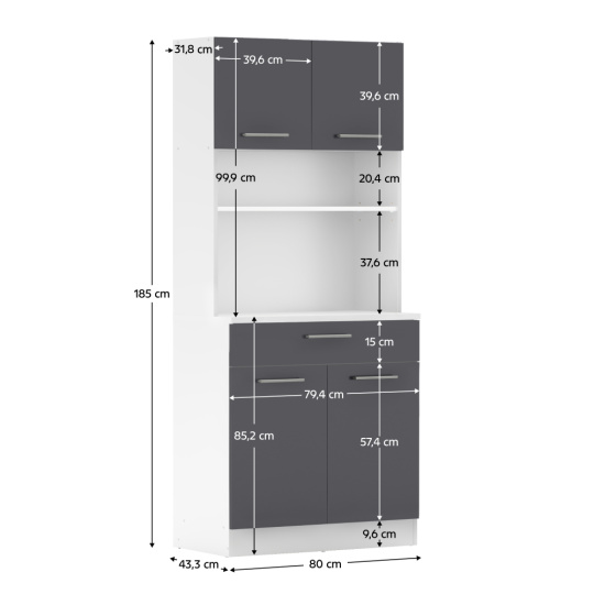Materiál: laminovaná DTD Barva: bílá/grafit Rozměry (ŠxHxV): 80x43,3x185 cm Tloušťka materiálu: 1,6 cm Tloušťka vrchního plátu spodní skříňky: 2,2 cm Čtyřdveřový Policový Nosnost police: 5 kg 1 zásuvka Rozměry zásuvky (ŠxV): 79,4x15 cm Nosnost zásuvky: 5 kg S úchytkami Materiál úchytek: PVC Barva úchytek: stříbrná Na kluzácích Praktický Víceúčelový Kvalitní slovenský výrobek Doporučujeme připevnit ke zdi Dodáváno v demontu