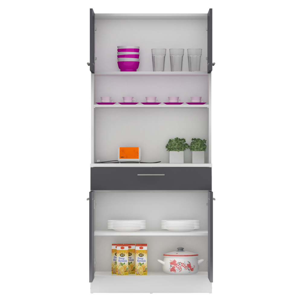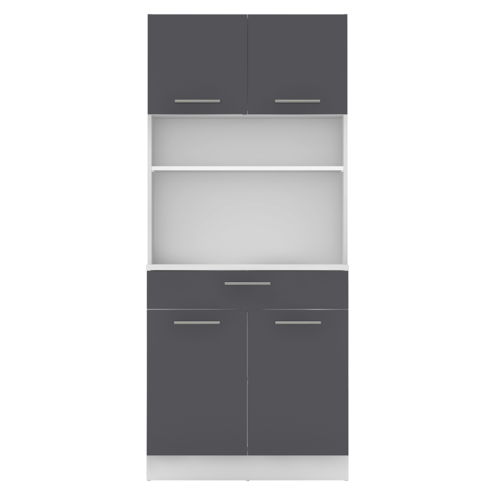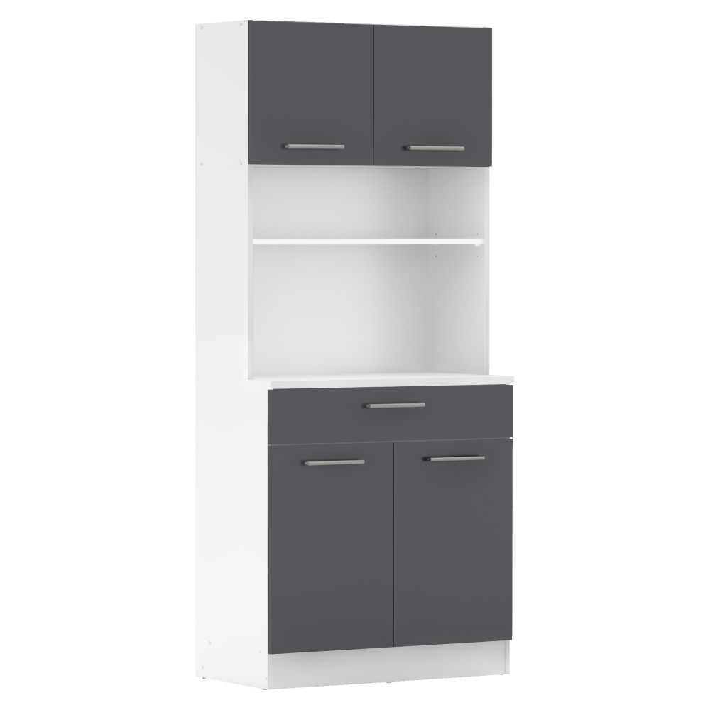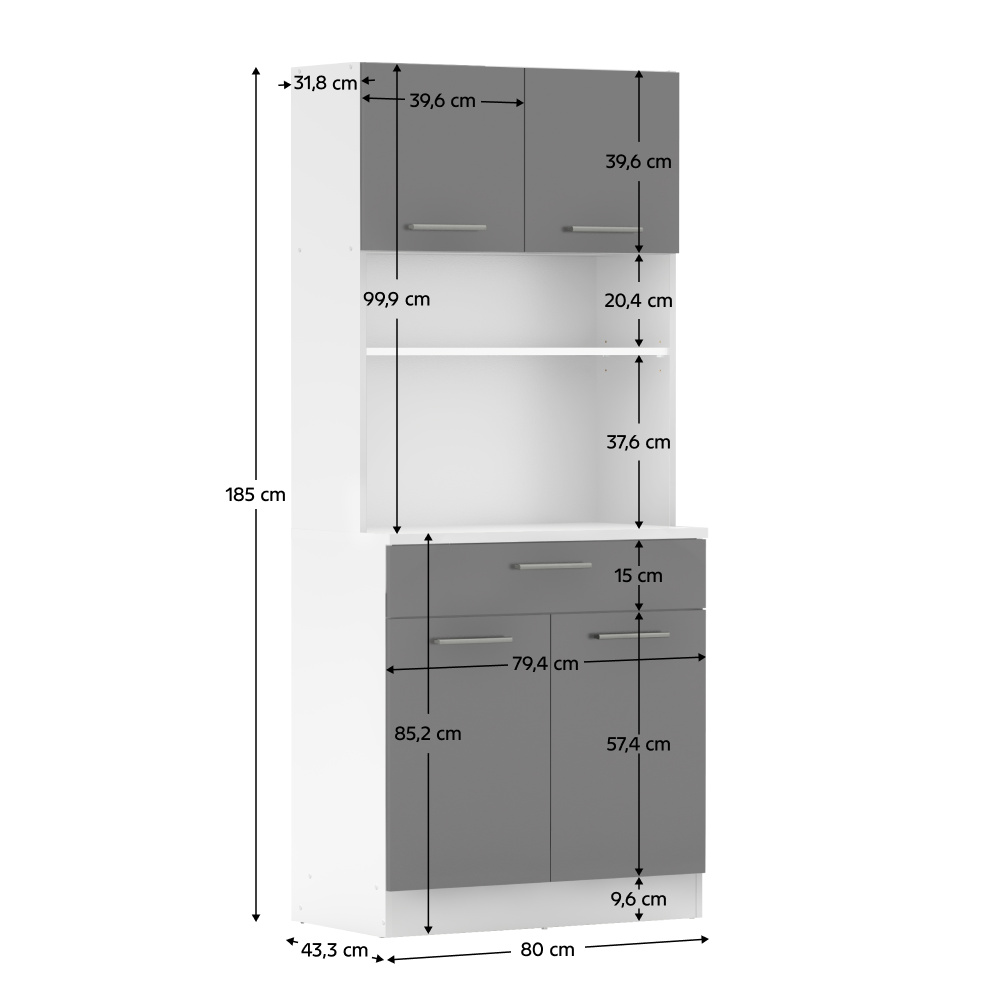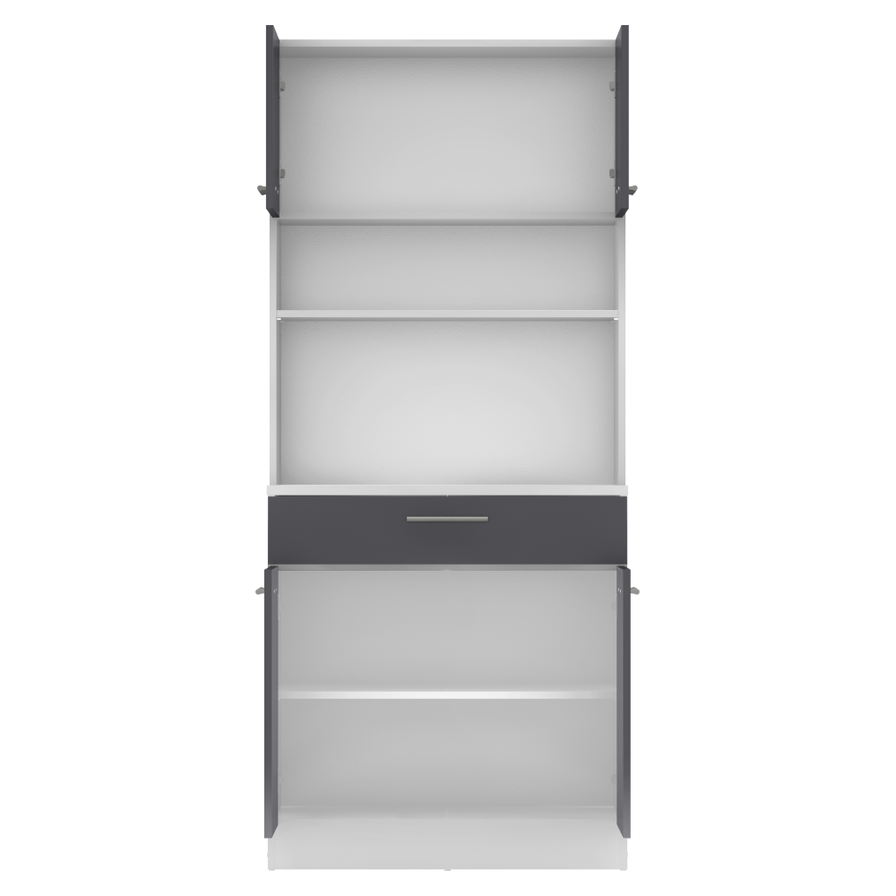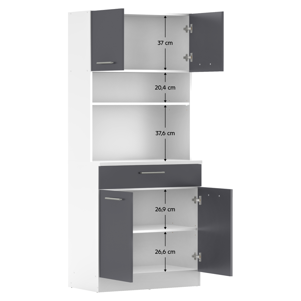 Materiál: laminovaná DTD Barva: bílá/grafit Rozměry (ŠxHxV): 80x43,3x185 cm Tloušťka materiálu: 1,6 cm Tloušťka vrchního plátu spodní skříňky: 2,2 cm Čtyřdveřový Policový Nosnost police: 5 kg 1 zásuvka Rozměry zásuvky (ŠxV): 79,4x15 cm Nosnost zásuvky: 5 kg S úchytkami Materiál úchytek: PVC Barva úchytek: stříbrná Na kluzácích Praktický Víceúčelový Kvalitní slovenský výrobek Doporučujeme připevnit ke zdi Dodáváno v demontu
