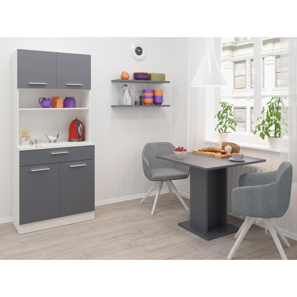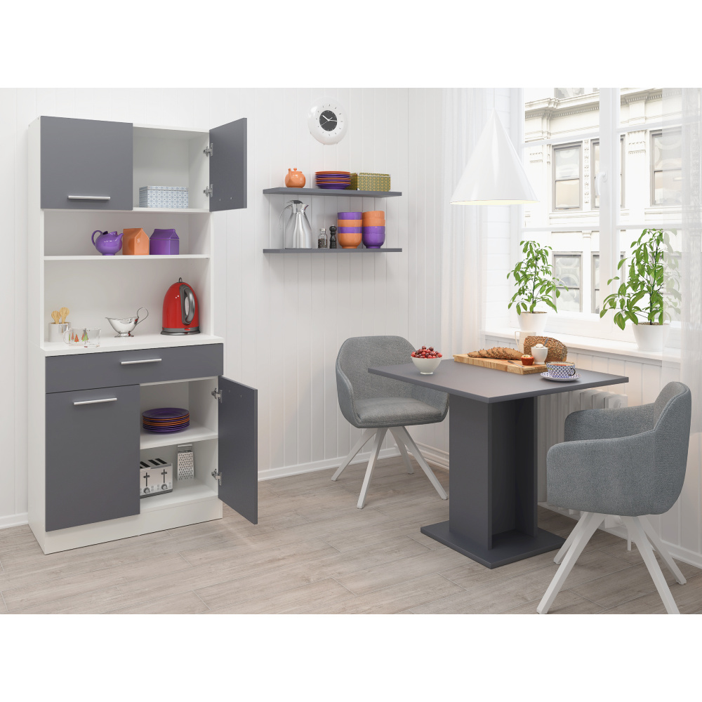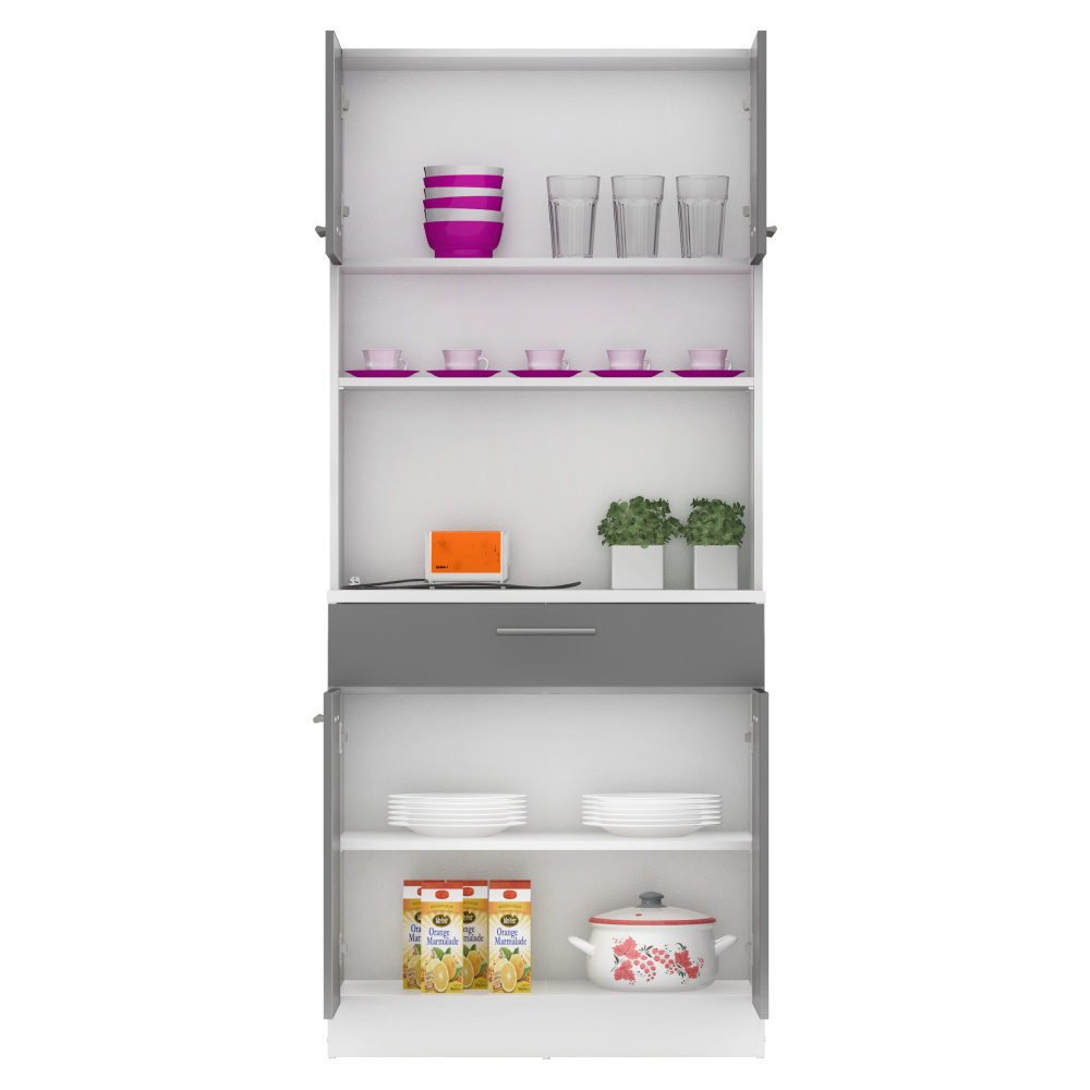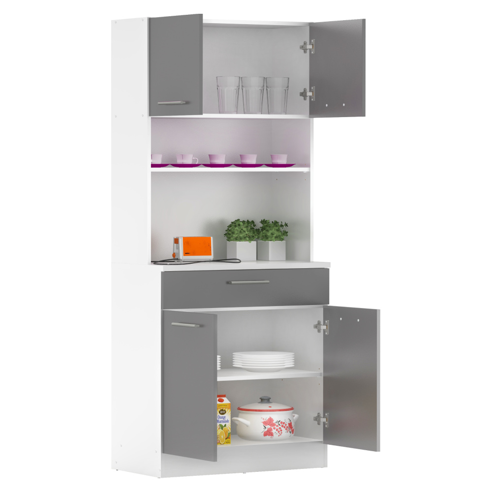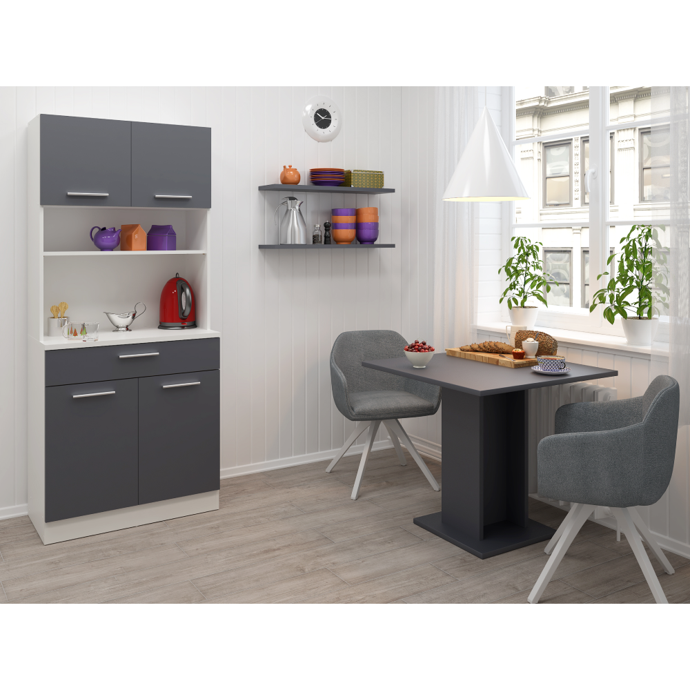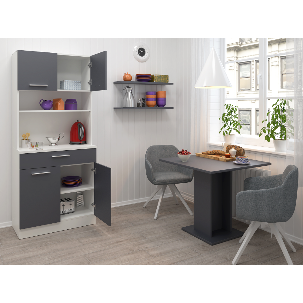 Materiál: laminovaná DTD Barva: bílá/grafit Rozměry (ŠxHxV): 80x43,3x185 cm Tloušťka materiálu: 1,6 cm Tloušťka vrchního plátu spodní skříňky: 2,2 cm Čtyřdveřový Policový Nosnost police: 5 kg 1 zásuvka Rozměry zásuvky (ŠxV): 79,4x15 cm Nosnost zásuvky: 5 kg S úchytkami Materiál úchytek: PVC Barva úchytek: stříbrná Na kluzácích Praktický Víceúčelový Kvalitní slovenský výrobek Doporučujeme připevnit ke zdi Dodáváno v demontu