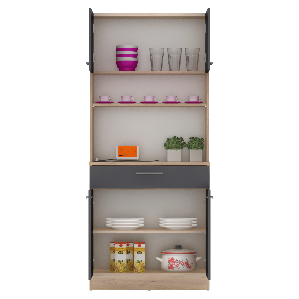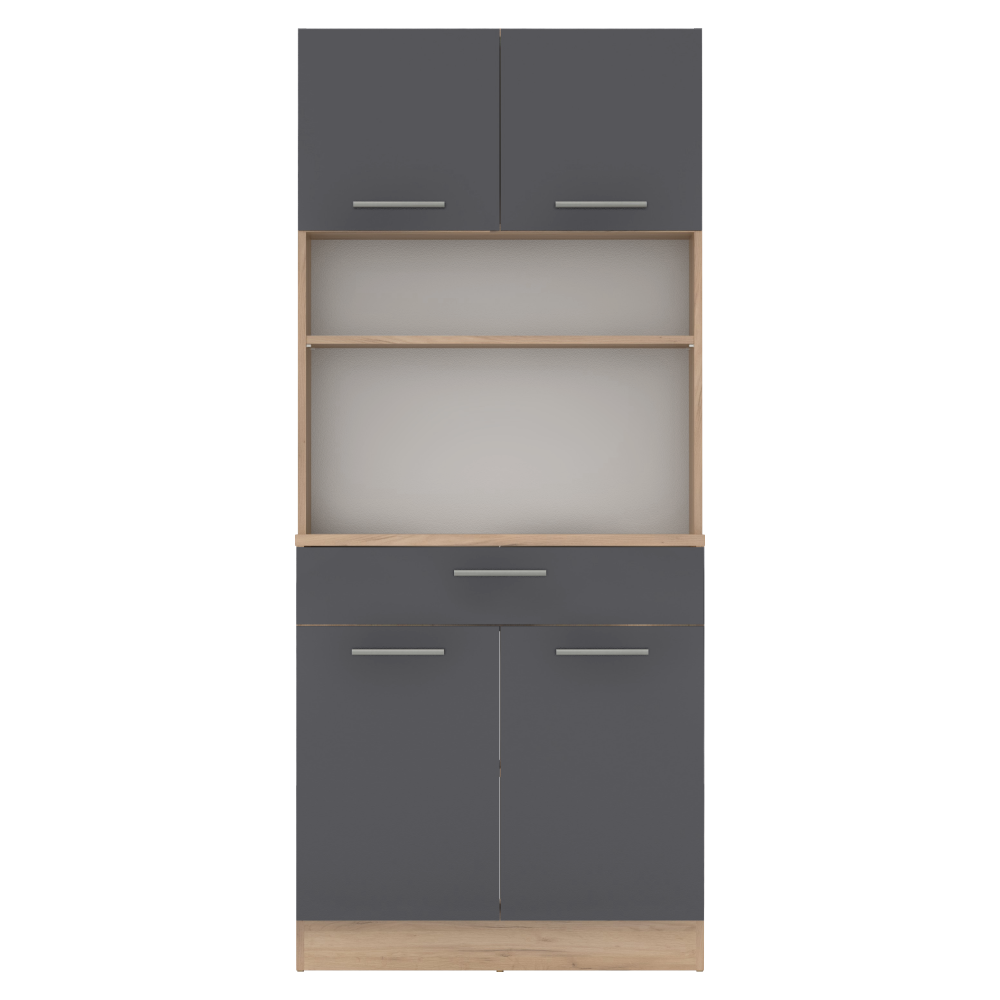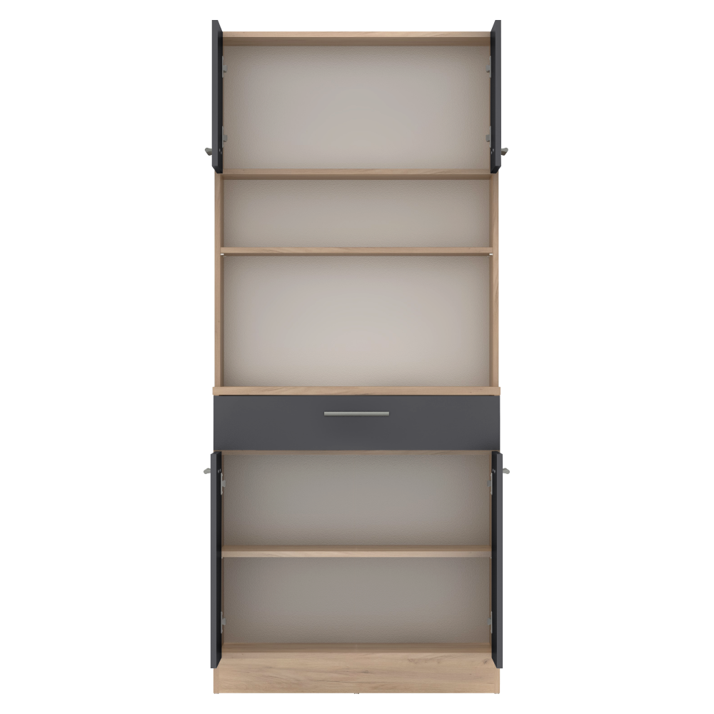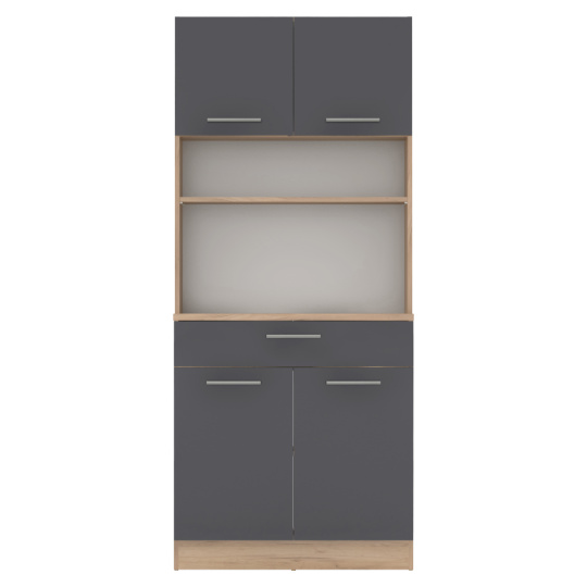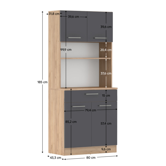 Materiál: laminovaná DTD Barva: dub artisan/grafit Rozměry (ŠxHxV): 80x43,3x185 cm Tloušťka materiálu: 1,6 cm Tloušťka vrchního plátu spodní skříňky: 2,2 cm Čtyřdveřový Policový Nosnost police: 5 kg 1 zásuvka Rozměry zásuvky (ŠxV): 79,4x15 cm Nosnost zásuvky: 5 kg S úchytkami Materiál úchytek: PVC Barva úchytek: stříbrná Na kluzácích Praktický Víceúčelový Kvalitní slovenský výrobek Doporučujeme připevnit ke zdi Dodáváno v demontu