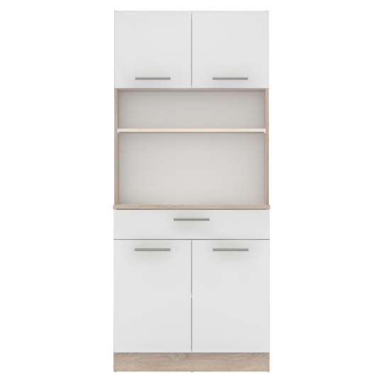 Materiál: laminovaná DTD Barva: dub sonoma/bílá Rozměry (ŠxHxV): 80x43,3x185 cm Tloušťka materiálu: 1,6 cm Tloušťka vrchního plátu spodní skříňky: 2,2 cm Čtyřdveřový Policový Nosnost police: 5 kg 1 zásuvka Rozměry zásuvky (ŠxV): 79,4x15 cm Nosnost zásuvky: 5 kg S úchytkami Materiál úchytek: PVC Barva úchytek: stříbrná Na kluzácích Praktický Víceúčelový Kvalitní slovenský výrobek Doporučujeme připevnit ke zdi Dodáváno v demontu