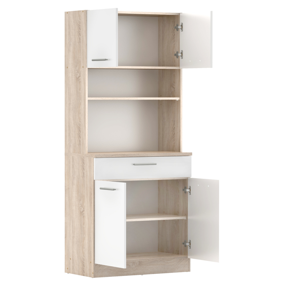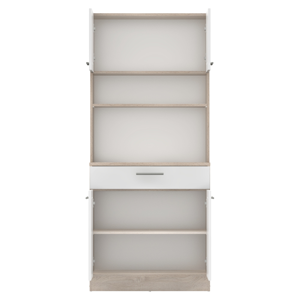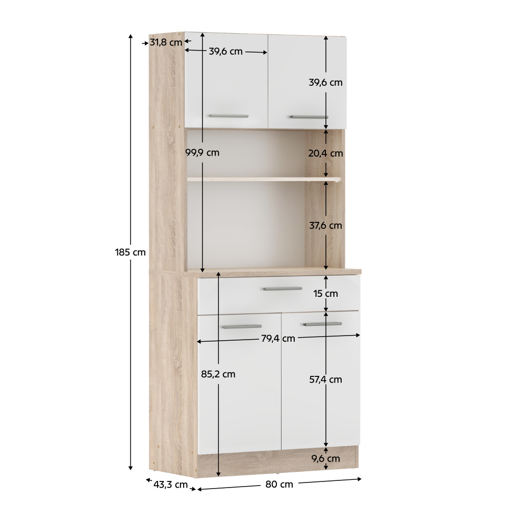 Materiál: laminovaná DTD Barva: dub sonoma/bílá Rozměry (ŠxHxV): 80x43,3x185 cm Tloušťka materiálu: 1,6 cm Tloušťka vrchního plátu spodní skříňky: 2,2 cm Čtyřdveřový Policový Nosnost police: 5 kg 1 zásuvka Rozměry zásuvky (ŠxV): 79,4x15 cm Nosnost zásuvky: 5 kg S úchytkami Materiál úchytek: PVC Barva úchytek: stříbrná Na kluzácích Praktický Víceúčelový Kvalitní slovenský výrobek Doporučujeme připevnit ke zdi Dodáváno v demontu