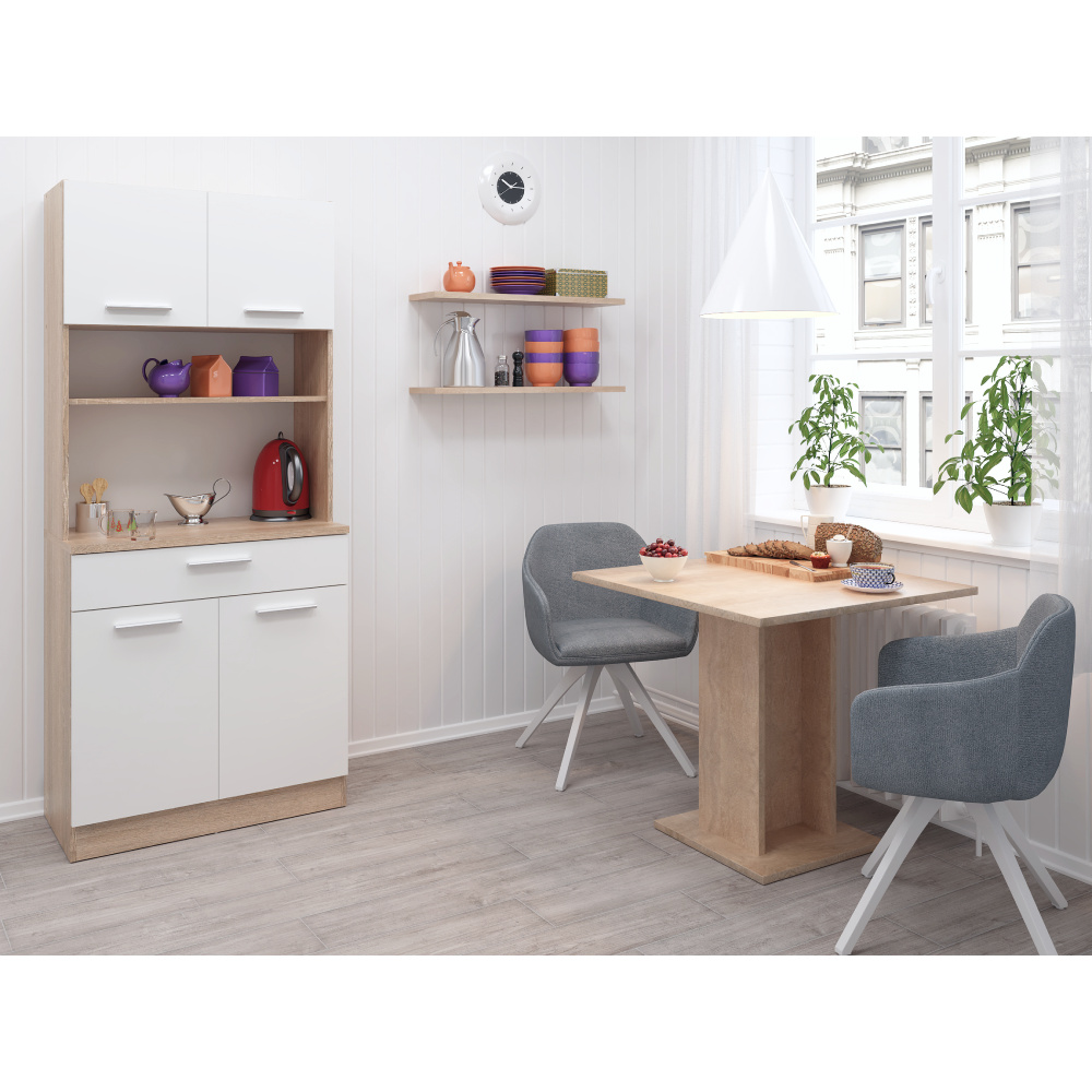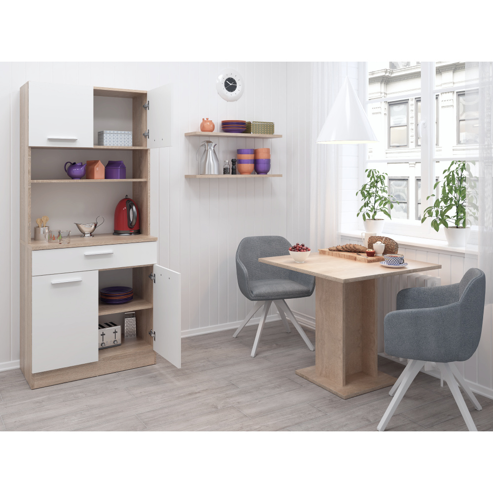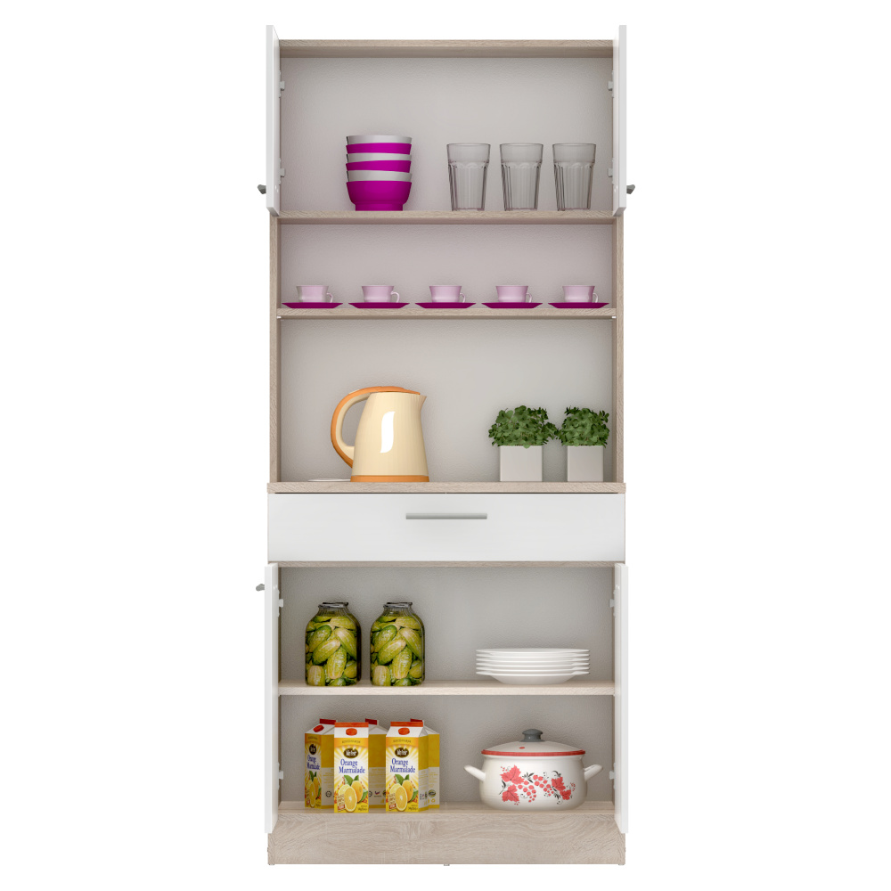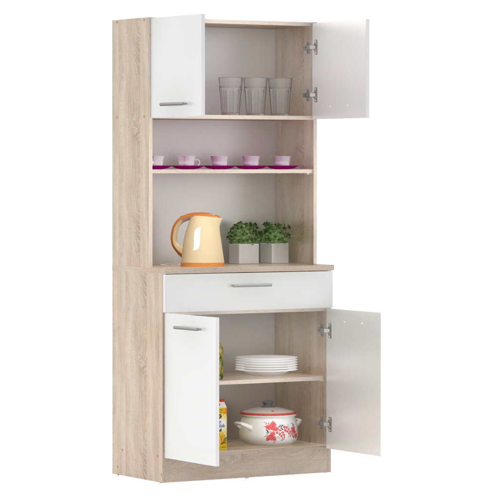 Materiál: laminovaná DTD Barva: dub sonoma/bílá Rozměry (ŠxHxV): 80x43,3x185 cm Tloušťka materiálu: 1,6 cm Tloušťka vrchního plátu spodní skříňky: 2,2 cm Čtyřdveřový Policový Nosnost police: 5 kg 1 zásuvka Rozměry zásuvky (ŠxV): 79,4x15 cm Nosnost zásuvky: 5 kg S úchytkami Materiál úchytek: PVC Barva úchytek: stříbrná Na kluzácích Praktický Víceúčelový Kvalitní slovenský výrobek Doporučujeme připevnit ke zdi Dodáváno v demontu