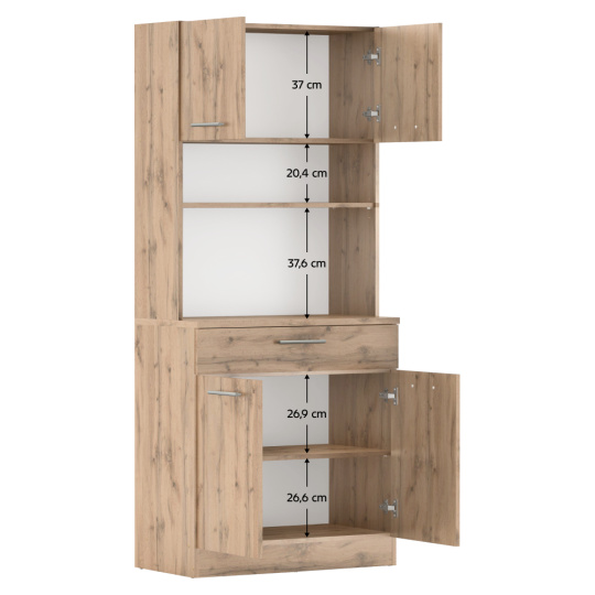 Materiál: laminovaná DTD Barva: dub wotan Rozměry (ŠxHxV): 80x43,3x185 cm Tloušťka materiálu: 1,6 cm Tloušťka vrchního plátu spodní skříňky: 2,2 cm Čtyřdveřový Policový Nosnost police: 5 kg 1 zásuvka Rozměry zásuvky (ŠxV): 79,4x15 cm Nosnost zásuvky: 5 kg S úchytkami Materiál úchytek: PVC Barva úchytek: stříbrná Na kluzácích Praktický Víceúčelový Kvalitní slovenský výrobek Doporučujeme připevnit ke zdi Dodáváno v demontu