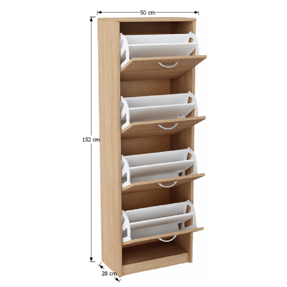 Čtyřřadý výklopný botník Materiál: DTD laminovaná Barva: dub sonoma / bílá Rozměry (ŠxHxV): 50x28x152 cm Tloušťka materiálu: 16 mm Čtyři výklopné úložné prostory Dodávané v demontu
