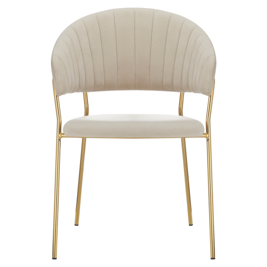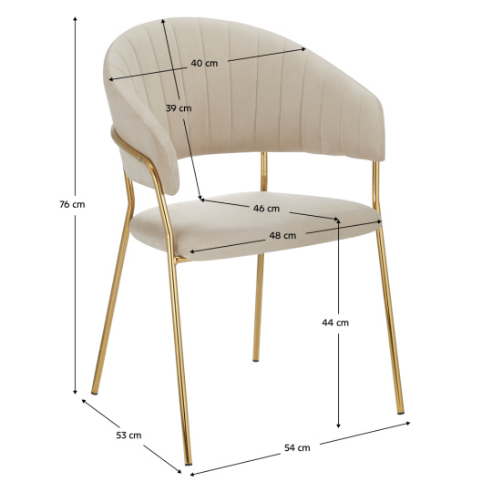 Materiál: látka Velvet/chrom Oděruodolnost textilie podle testu Martindale: 80 000 oděrů Barva: béžová/gold chrom zlatý Rozměry (ŠxHxV): 57x53x76 cm Výška sedu: 46 cm Hloubka sedu: 46 cm Šířka sedu: 48 cm Výška zádové opěrky: 39 cm Šířka zádové opěrky: 45 cm Nosnost: 100 kg Kovová konstrukce Designové Prošívané Dodáváno v demontu