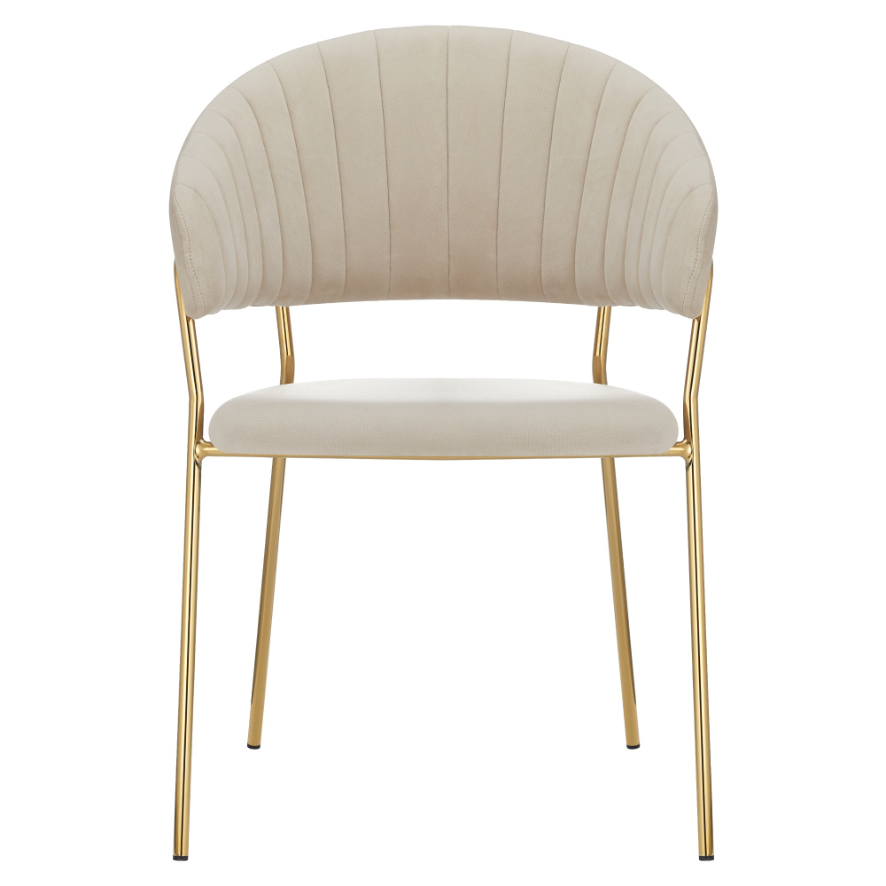 Materiál: látka Velvet/chrom Oděruodolnost textilie podle testu Martindale: 80 000 oděrů Barva: béžová/gold chrom zlatý Rozměry (ŠxHxV): 57x53x76 cm Výška sedu: 46 cm Hloubka sedu: 46 cm Šířka sedu: 48 cm Výška zádové opěrky: 39 cm Šířka zádové opěrky: 45 cm Nosnost: 100 kg Kovová konstrukce Designové Prošívané Dodáváno v demontu