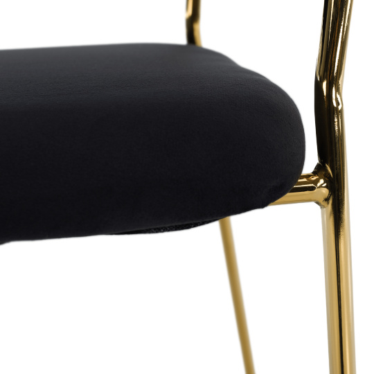 Materiál: látka Velvet/chrom Oděruodolnost textilie podle testu Martindale: 80 000 oděrů Barva: černá/gold chrom zlatý Rozměry (ŠxHxV): 58x53x81,5 cm Výška sedu: 45,5 cm Hloubka sedu: 41 cm Šířka sedu: 49 cm Výška zádové opěrky: 40,5 cm Šířka zádové opěrky: 57 cm Nosnost: 100 kg Kovová konstrukce Designové Prošívané Dodáváno v demontu